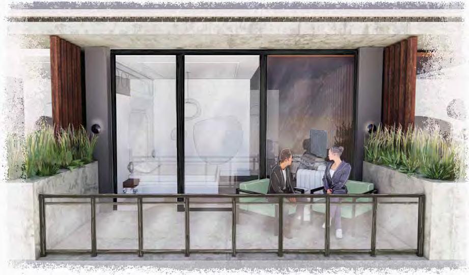 The hotel rooms are placed on the second floor, in order to allow for privacy, and to take advantage of the views. There are three different types of hotel rooms each with the same bathroom and balcony. The hotel rooms are offered as a one bed suite, two king bed suite, and two one bedroom suites that are joined.