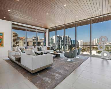 The Plaza at Five Points epitomizes modern ease and convenience with urban sophistication, and this 17th-floor penthouse, perched high above the vibrant cultural epicenter of Sarasota, captures the energy and beauty of the city below. Expansive windows reveal dazzling skyline and bay views, while the terrace provides a front-row seat to glowing sunsets. Inside, contemporary style and warm ambiance combine to create a serene and refined private retreat in the heart of downtown.