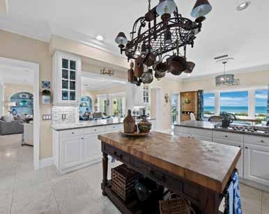 The chef’s kitchen is a showpiece, centered around a Labradorite Lemurian Blue granite