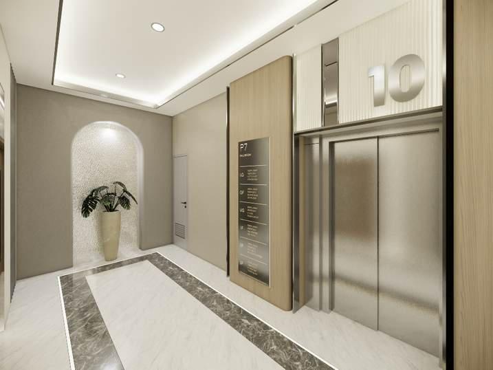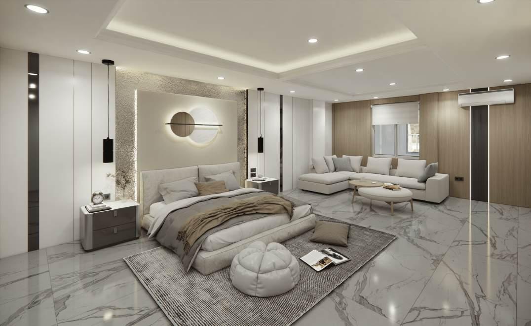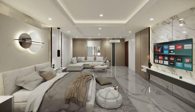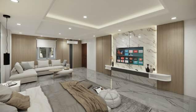 The space exudes modern luxury, that accentuates bright neutral colours which harmonizes with dark accents to give an inviting atmosphere, also enhancing the understated elegance of the decor.