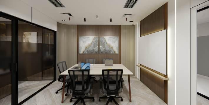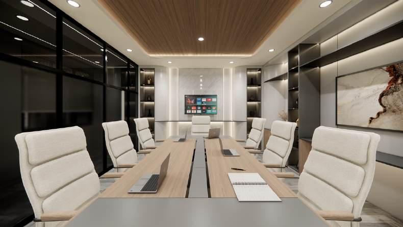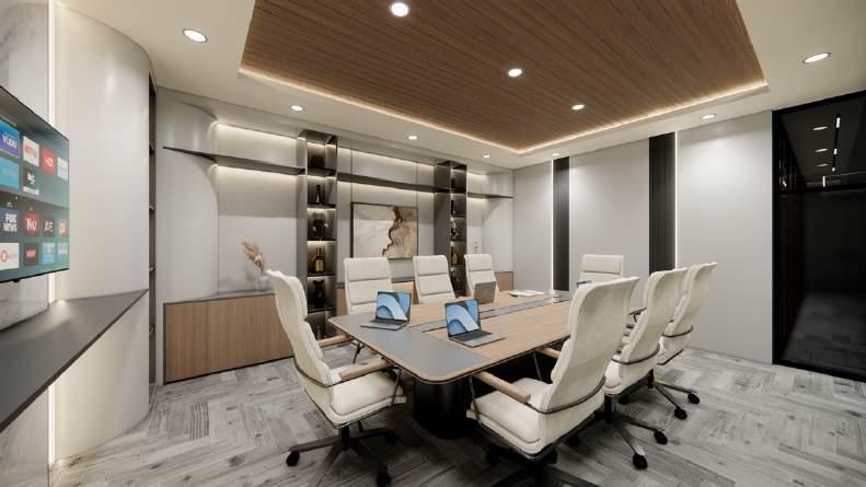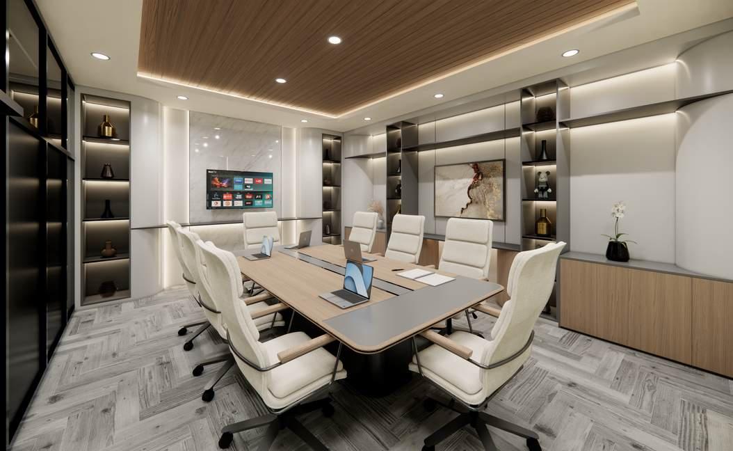 A premium conference room that feature a natural wood focal point that is both functional and aesthetically pleasing. Function to produce a welcoming ambiance that is conducive to collaborative endeavors.