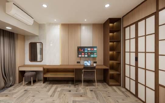 Minimal yet elegant, are two words that best describe this bedroom design. Usage of various colours and textures, compliment each other giving a simple and also luxurious feel for the owners