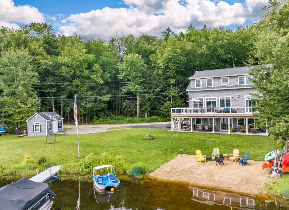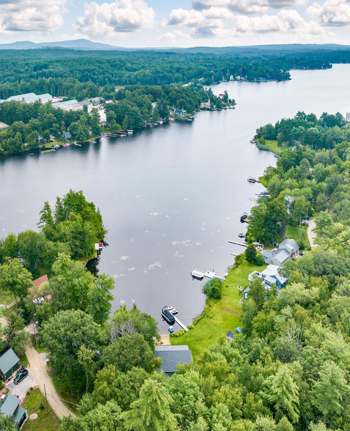 Perfectly sited with wide open sunset views, direct waterfront. Walk out onto your dock from the lower level. Prime frontage on the shores of the pristine 653+ acre Northwood Lake with open views. Complete with several sitting areas to enjoy the lakeside life.The full activity lake is teaming with nature including several loon nesting gorounds.