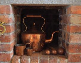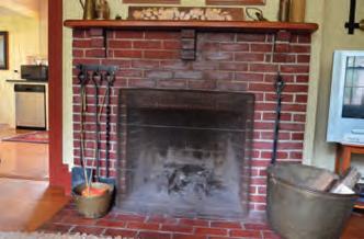 Brick fireplace with detailed wood mantle, oven and ash storage