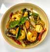 Mixed seafood with Udon noodle, bell peppers, onions in spicy sauce and topped with fried basil