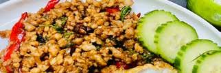 Ground chicken or ground pork Bell peppers, onions and Thai hot basil in Brown sauce