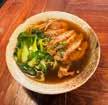 Rice noodles, roasted duck, bean sprouts, scallions, bok choy, cilantros topped with crispy garlic