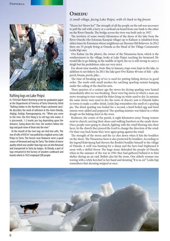 In 1924 Karl Robert Keerberg wrote his graduation paper at the Department of Forestry of Tartu University titled “Rafting timber in the Northern Peipsi catchment area”. He describes the work of raftsmen in the rivers Omedu, Alajõgi, Avijõgi, Rannapungerja, etc. “When you come to the river, the first thing is to roll logs into water, it is piecework, 1-2 marks per log depending upon the distance. Going down the river, the workers follow the logs and push more of them into the river.” At the mouth of the river logs are tied into rafts. The row of rafts of 650 m3 was pulled by a tugboat across Lake Peipsi to Tartu. The forests near Kodavere were a good source of firewood and logs for Tartu. The timber of worse quality which was smaller than logs was cut into firewood and transported to Tartu by barges. At Omedu a part of logs remained in the factory of wooden cardboard and boards which in 1923 employed 200 people.