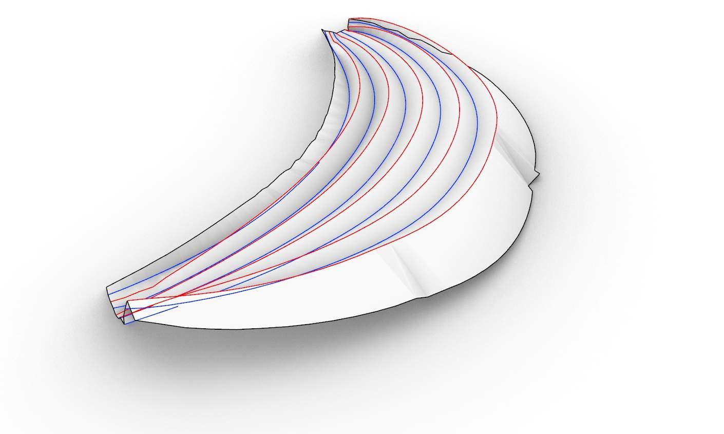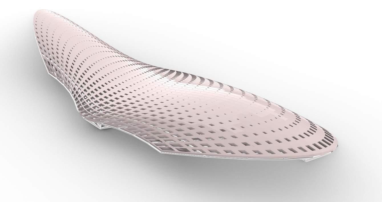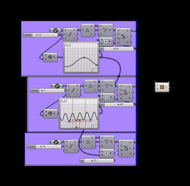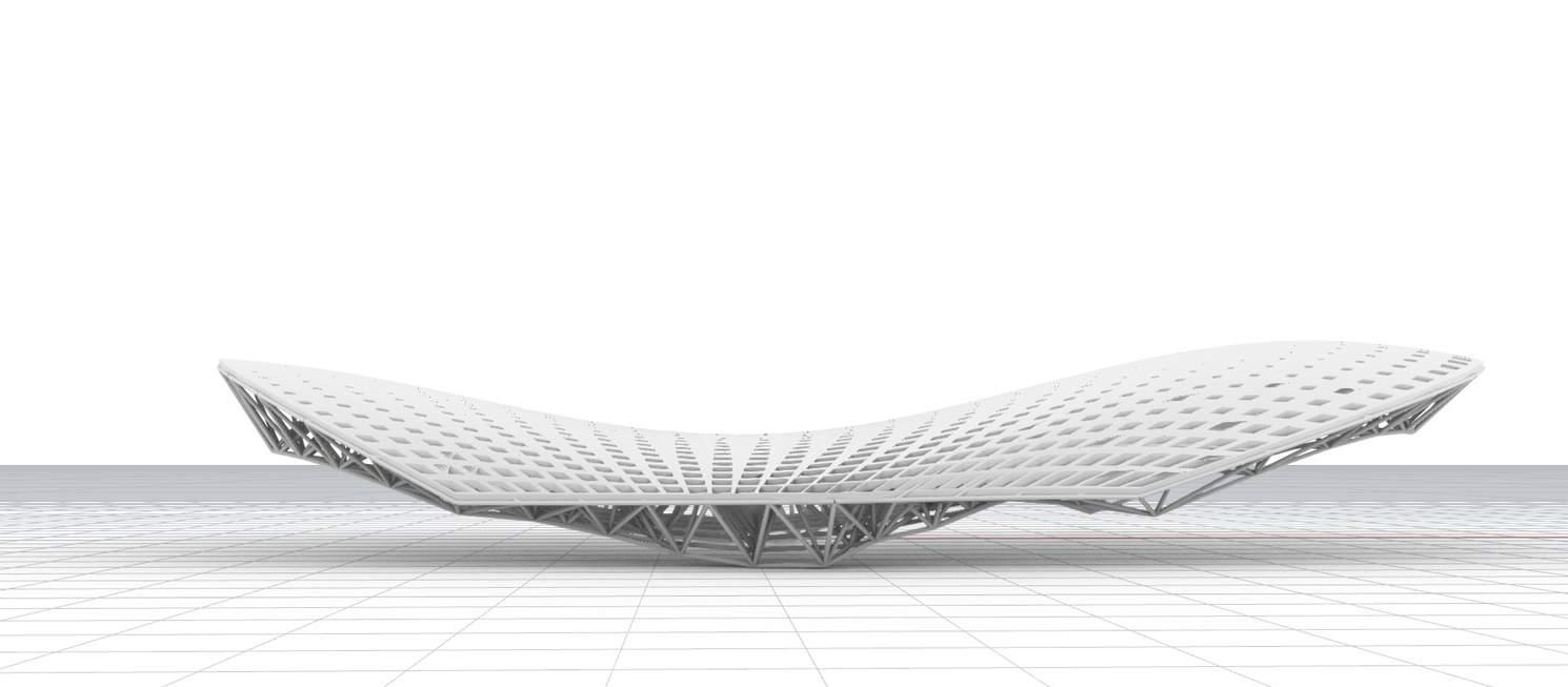 The model is reconstructed based on the principle of deconstructing mass into its simplest components: points, lines, arcs, and planes The first step involves placing the points in their appropriate locations before connecting them to form lines and arcs Then, the bounding curves are transformed into a plane to complete the mass. Once the basic form is achieved, a pattern is applied using a script that utilizes image patterns