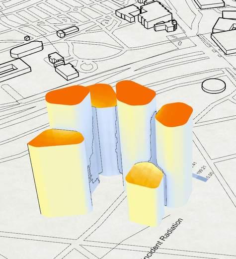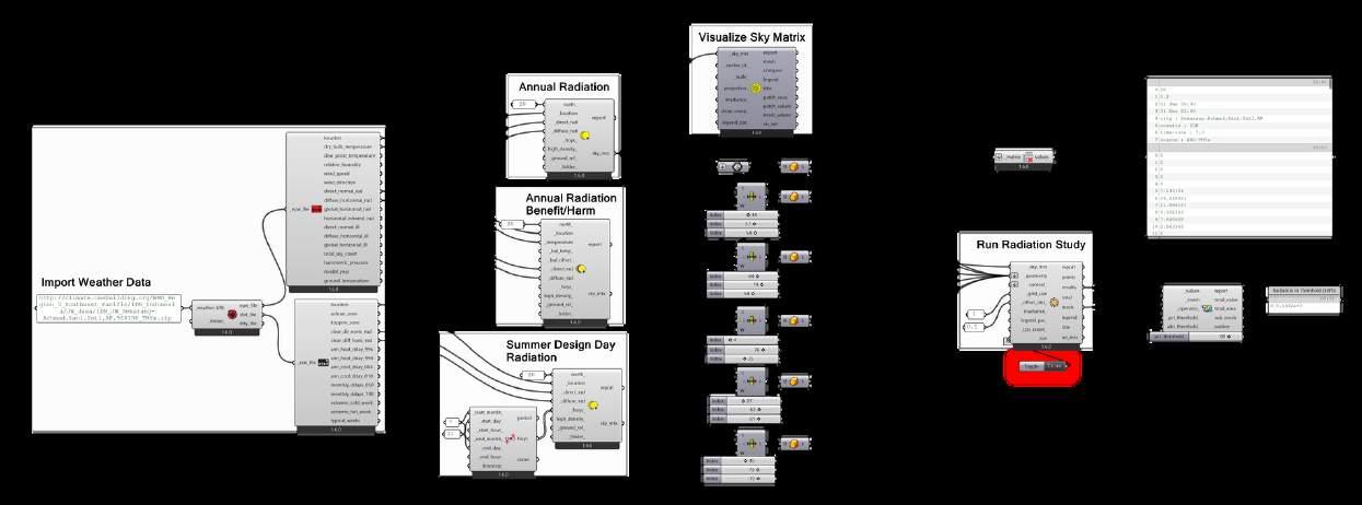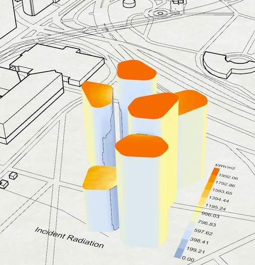 The script visualizes the radiation levels experienced by building facades based on their orientation, context, and available geoclimatic data The radiation levels are visualized using a color range from blue to red, with the highest radiation intensity represented by the color red, while shaded areas are colored blue