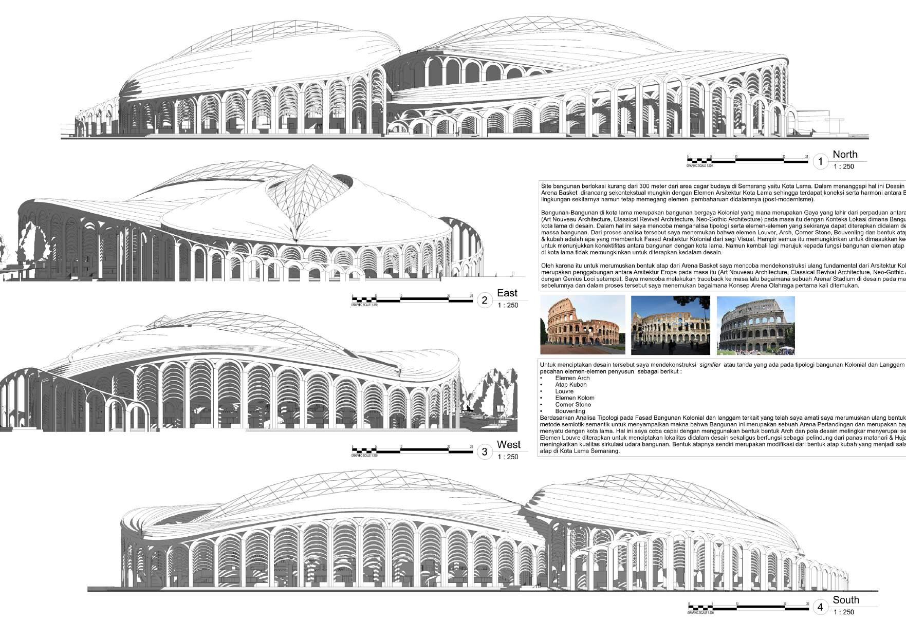 Based on the typological analysis of colonial and related architectural facades that I have observed, I reinterpreted the form of the facade using semiotic and semantic methods to convey the meaning that this building is an arena for competitions and seamlessly integrates with Kota Lama This was achieved by incorporating arch shapes and circular design patterns reminiscent of a colosseum The Louver element is applied to establish a sense of locality within the design while serving as protection from sunlight and rain, as well as enhancing the building's airflow quality The roof design is a modification of the dome-shaped roofs found in Kota Lama, Semarang By utilizing these fragmented elements, the design aims to harmoniously blend the aesthetics and functionality of a basketball arena while capturing the essence of the surrounding architectural context