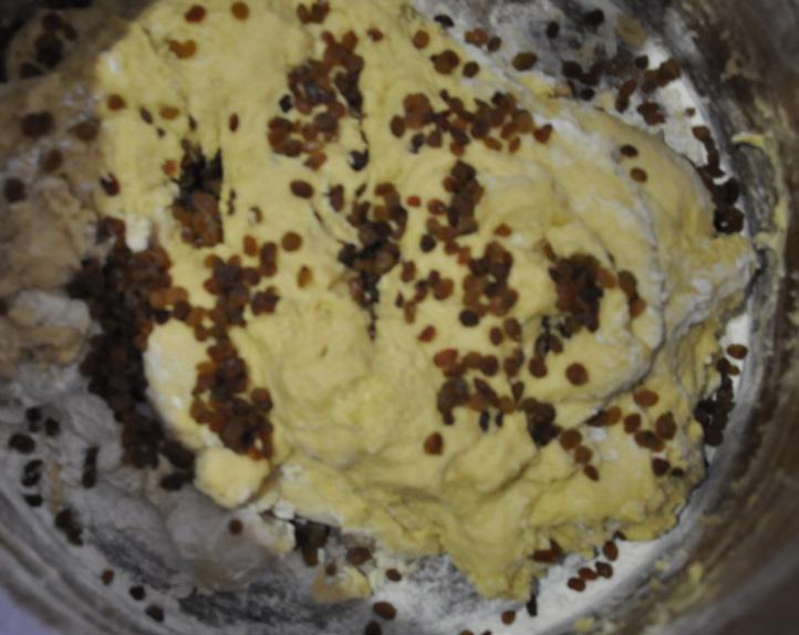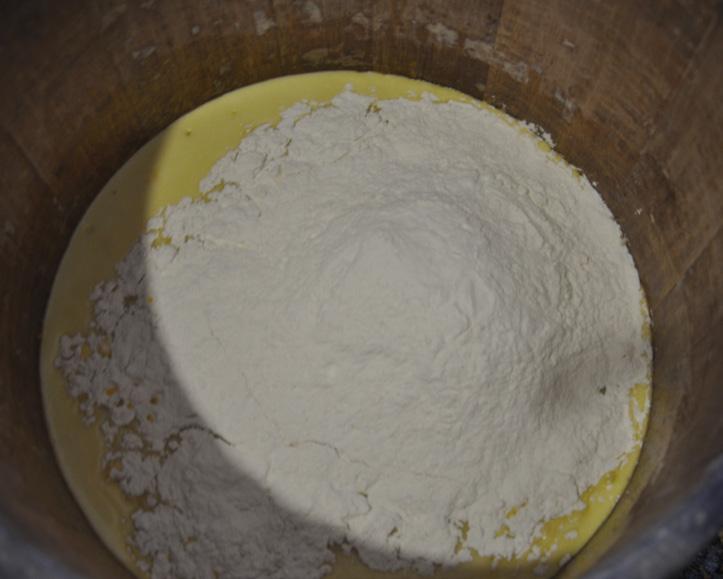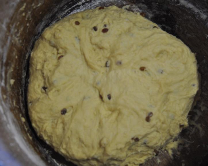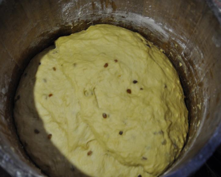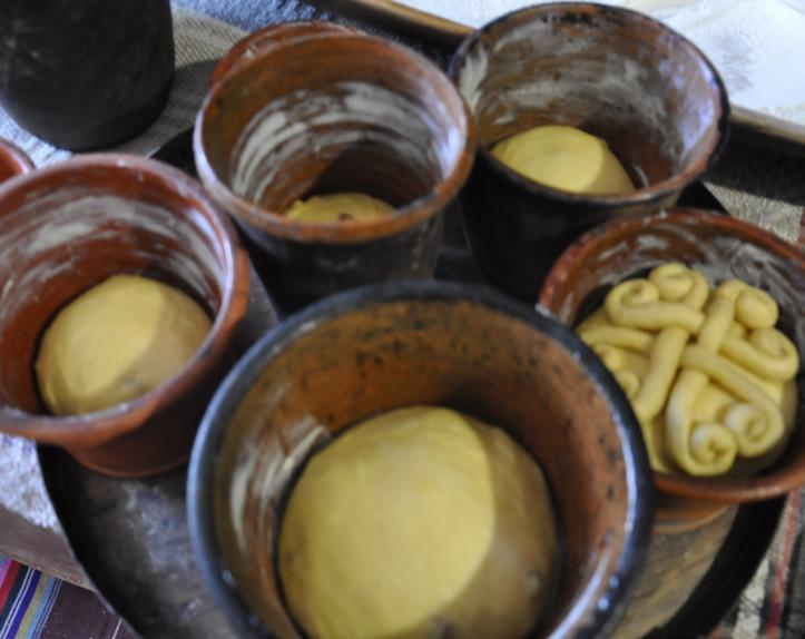 рівномірно розійшлись по всьому тісту (фото 6). Як вимісили, накриваємо діжу кришкою, закутуємо і ставимо діжу в тепле місце на дві години, щоб тісто підійшло. А тим часом розкладаємо дрова в печі, розпалюємо піч хай горить (фото 7), мастимо форми, пасківники вершковим маслом (фото 8), коли тісто підійшло (фото 9), формуємо з тіста кульки відносно розміру наших форм, тіста має бути на 1/3 у формі (фото10) приблизно так потрібно орієнтуватись.