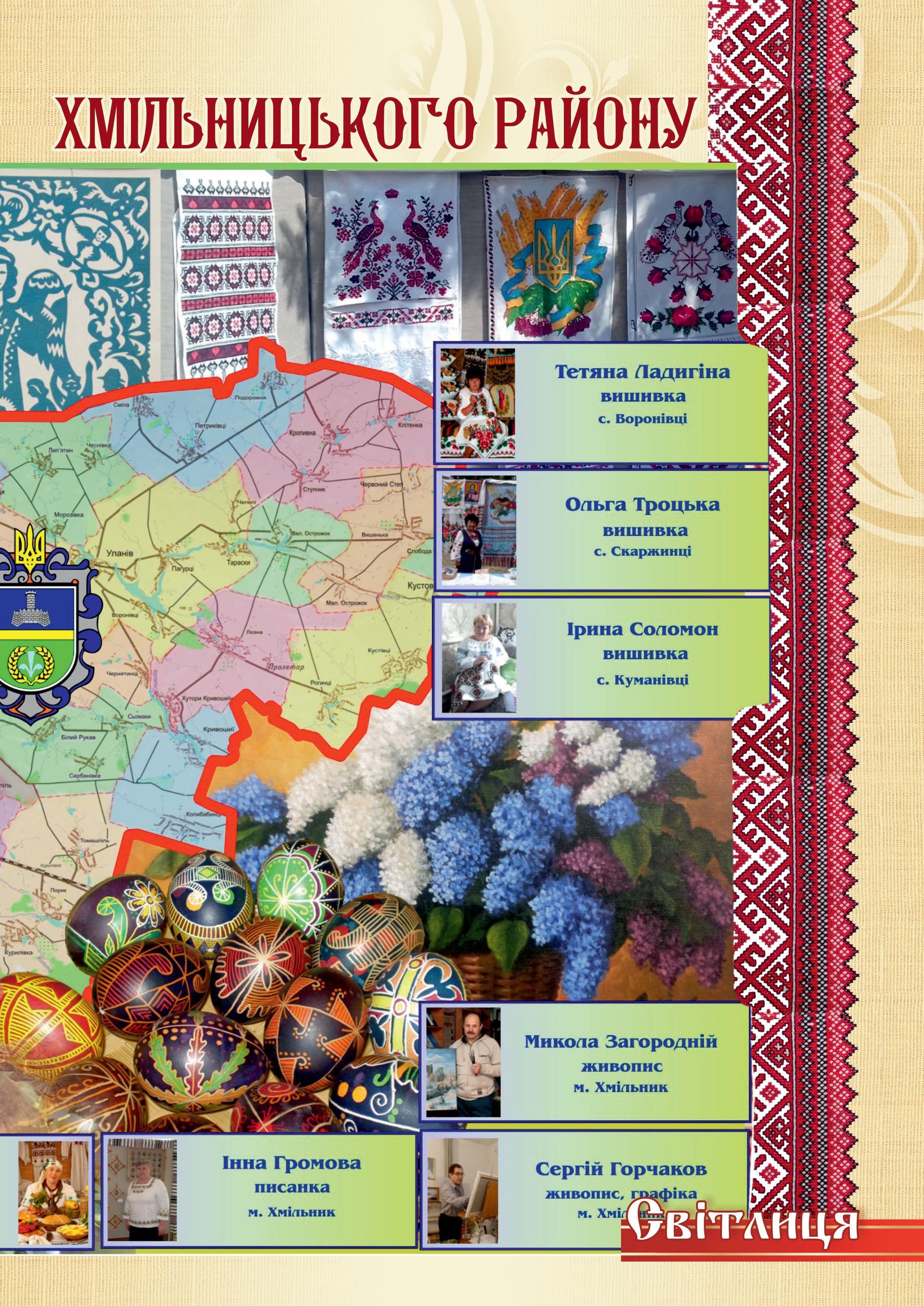 натхненні Ольга Лук’яненко і Ганна Лагуна; в Тиврові, де навчає діток писати писанки директор краєзнавчого музею Антоніна Олімчук; у Хмільнику, де творить Наталя Громова та багато інших відомих писанкарок.