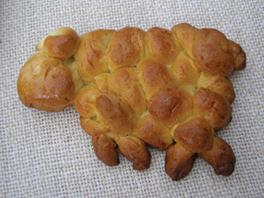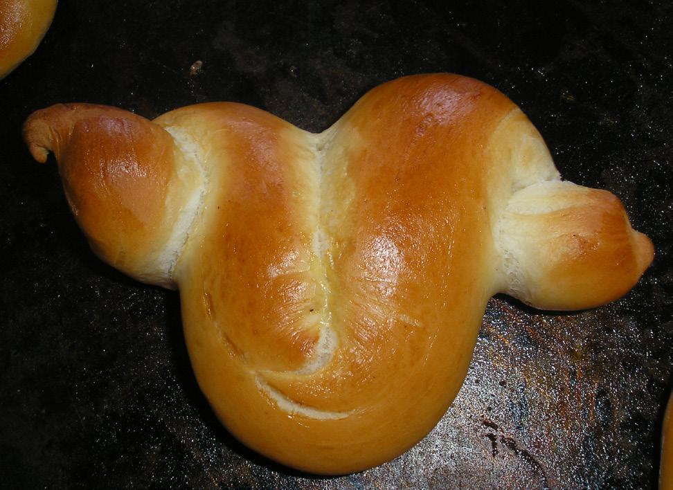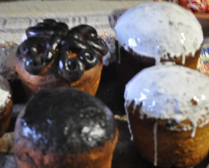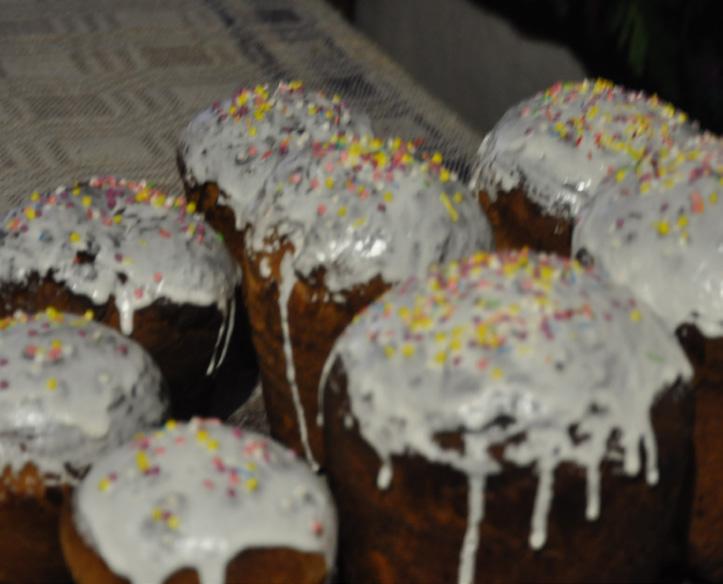 і тісто підніметься у три рази. Слідкуємо, щоб в печі не перегоріло, підкидаємо дрова, але і спостерігаєм як біліє піч тобто, як нагрівається. Коли піч напалилася, вона буде біла, ми розгортаємо жар по усій черені хай гнітиться. А ми тим часом збиваємо одне яйце у піну і мастимо наші баби, які вже підійшли. Змастивши яйцем, вигортаємо з печі жар, який залишився і саджаємо в піч наші баби рівномірно по всій печі, як тільки поставили останню – закриваємо піч затулою і дивимось на годинник. Баби мають випікатись 45 хвилин, але якщо є зовсім маленькі то 40хв.буде достатньо. Поки бабки печуться, беремо один яєчний білок, збиваємо в піну, потім додоємо пів-склянки цукрової пудри і збиваєм знову, потім додаєм ще пів - склянки пудри і збиваємо до однорідної маси - полива наша готова. Коли достали баби з печі (фото 11), беремо кожну бабку, змащуємо поливою і посипаємо різними великодніми присипками (фото 12). І все, наша баба готова, бажано розрізати коли охолоне (фото13).