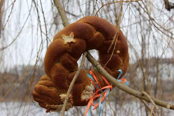 горілку і хліб. Хліб лишали в дуплі, а горілку лили на дуби» (запис Корешкової А.Д. С. Думенки, Хмільницький р-н). «До сходу сонця в Чистий Четвер йшли з хлібами та рушниками до кринички «Дівоньки». Брали воду, рушники вивішували на дерева, а хліб клали поруч. Така вода вважається цілющою. По дорозі додому вибирали високого стрункого дуба, обходили його за сонХліб для води Хліб з дубовим листям. Музей І. Гончара, Київ, 2011 р.