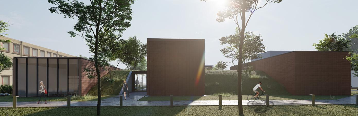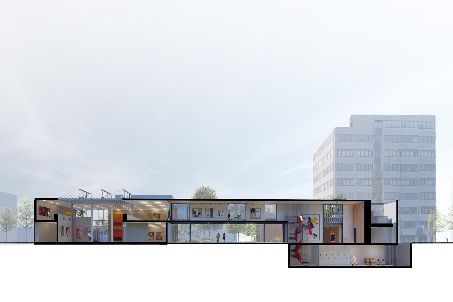 Through a central elevated volume, made out of steel, a direct connection is created with the existing, physically bridging the gap between the two. The articulation of this volumes, is influenced by the geometric proportions of the existing and the volumes of the new wing, follow the design principles of Rietveld’s gallery. The sides of the volumes are mostly closed, while the elevations that face the monument, are fully glazed, instigating a dialogue between the two.