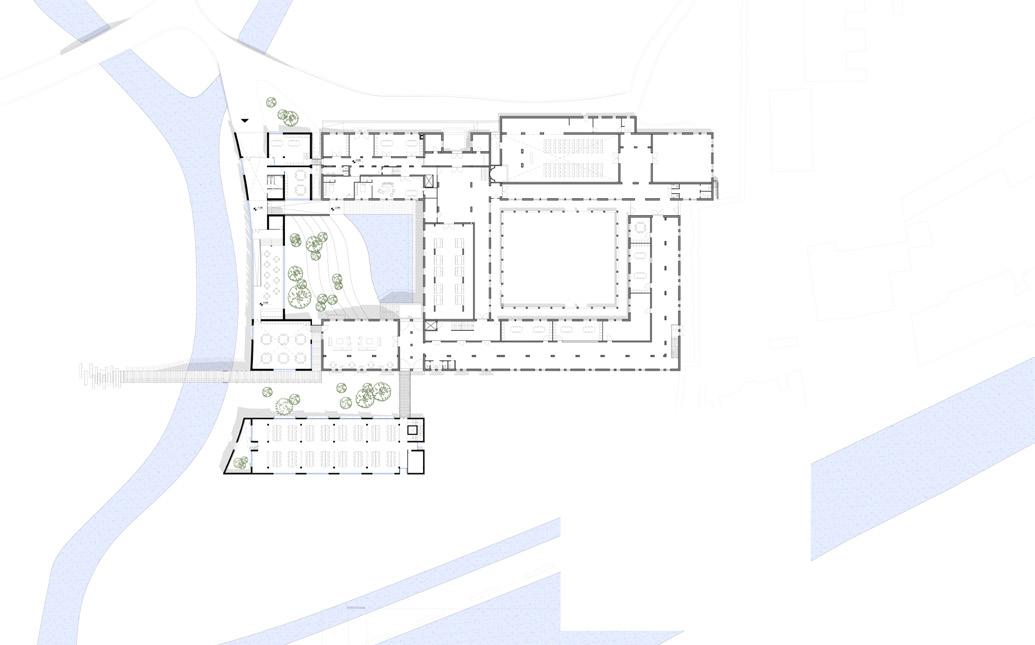 Being a priory, the building is characterised as introvert, composed of different volumes and featuring a closed courtyard and a forecourt with views of the landscape. The new extension proposes a more transparent and inviting approach, and acts as a gesture to the visitor. Topographical features, such as the existing walkways and the river, played a key role in the positioning of the extension and the location of the new public entrance.