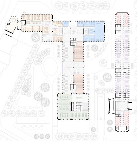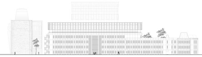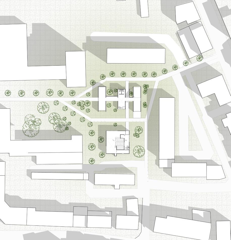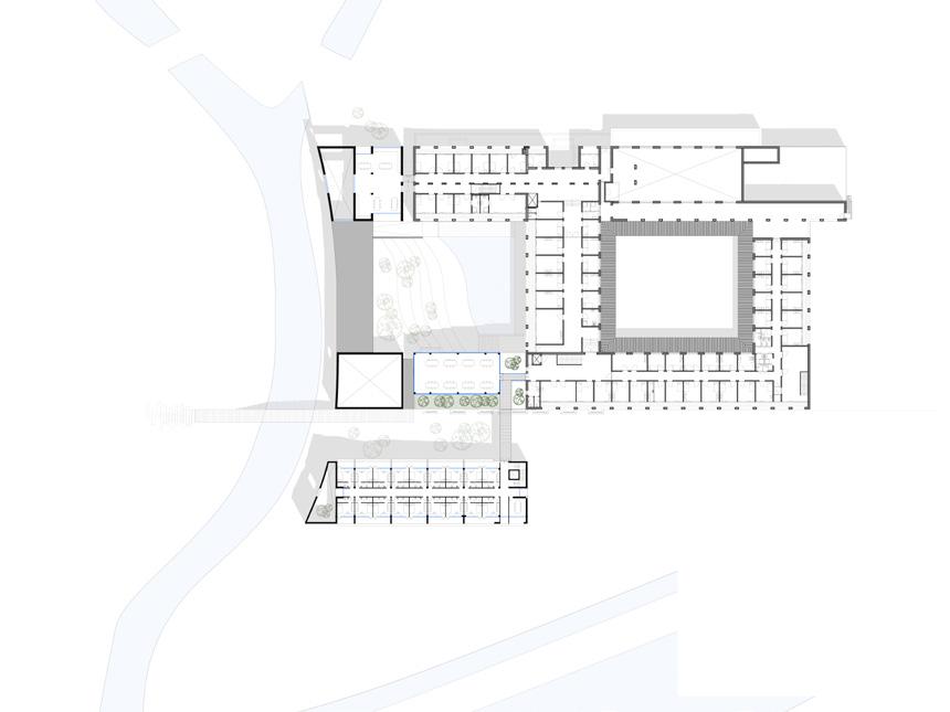The existing forecourt is transformed into a second courtyard, where public functions such as a restaurant are added.
