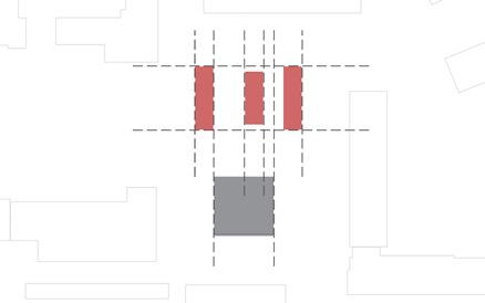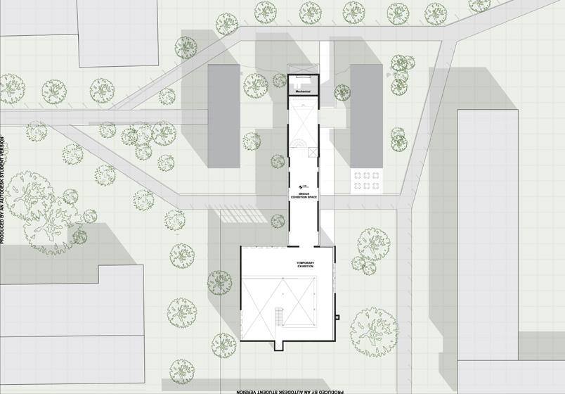 The proposal draws inspiration from the proportional system and the refined detailing of the historic gallery, which in the end is represented as an ensemble of free-standing objects, connected with the monument. On the ground plane, three vertical volumes are connected through a horizontal one, which forms an enfilade and is aligned to the exterior walkways.
