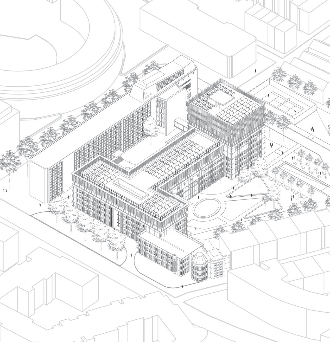 By 2024, the police headquarters in the Hague, will become vacant. The future of the 50.000m2 building remains unknown, while the only proposal suggests the demolition of a large portion of the building, which features a robust structure. To that end, the project focuses on finding an appropriate solution, that can utilize the existing, prevent unnecessary demolition, and make use of the police-identity of the station for the new program.