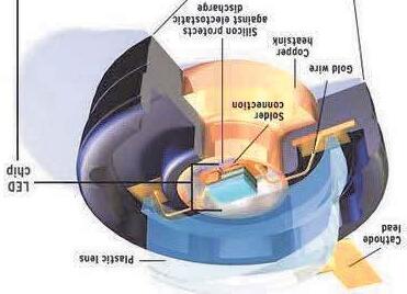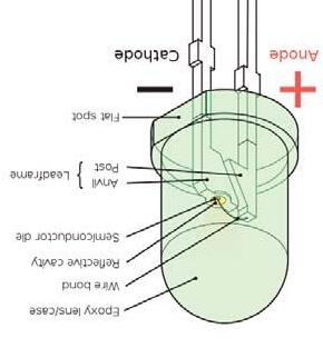El LED consiste en un chip de material semiconductor “dopado” con impuridades para crear una “unión p-n”. Como en otros diodos, la corriente fluye desde el polo positivo P (ánodo) al negativo N (cátodo), pero no en la dirección inversa.
