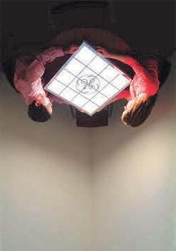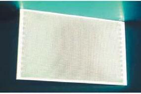 Panel de policarbonato serigrafiado con LED colocados en los cantos. La luz se difunde gracias a la serigrafia.