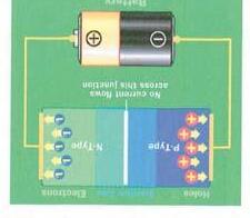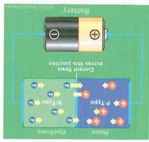 Si en cambio conectamos la parte N con el polo negativo y la parte P con el polo positivo (polarización directa) la corriente circula a través del diodo. Cuando elelectrón encuentra un agujero, cae a un nivel de energía más bajo y emite energía en forma de fotón (luz).