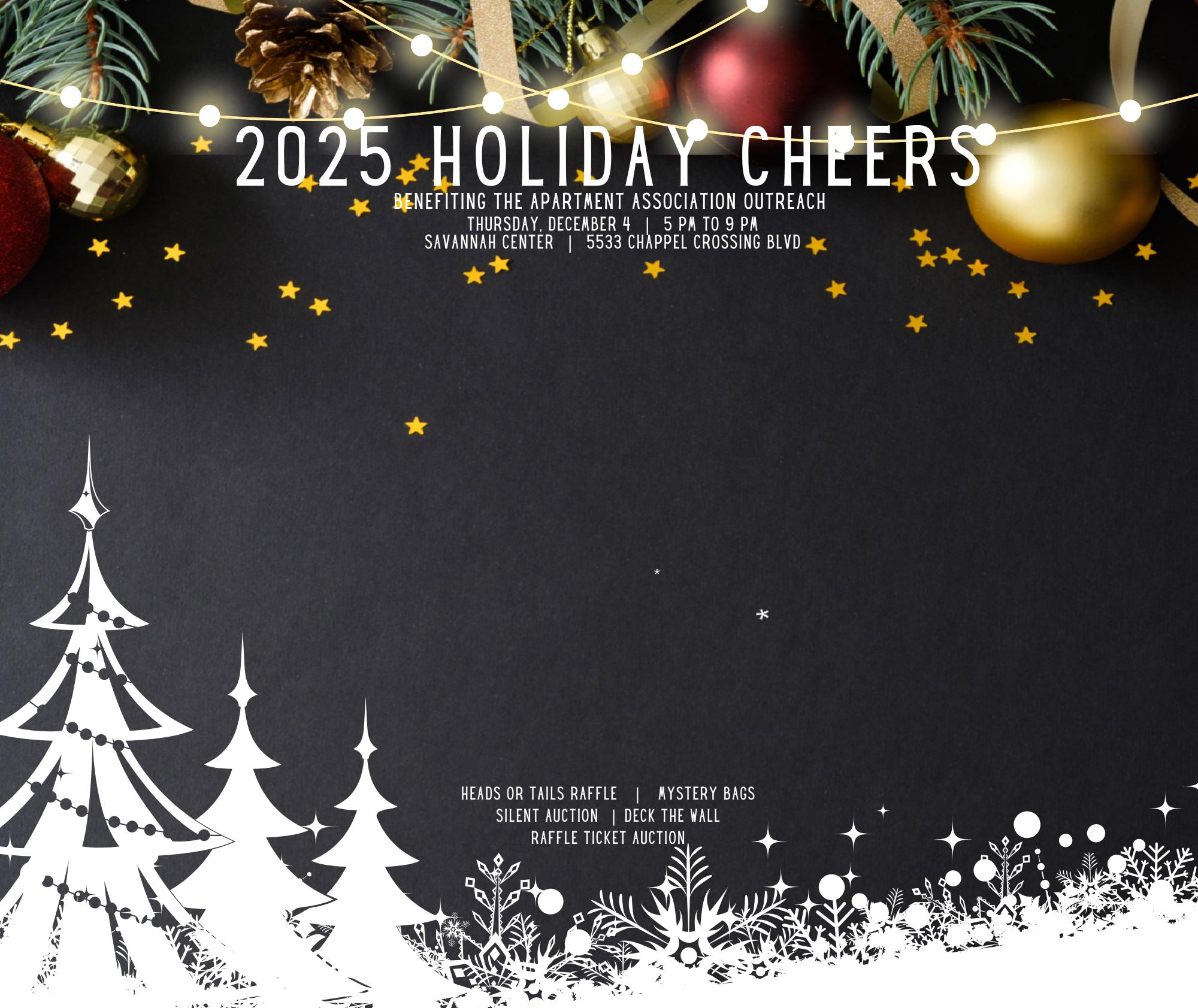Do you hear what we hear? It’s time for the 2025 Holiday Cheers Party & Outreach Benefit! We’re ringing in the 28th year of this beloved tradition, and the committee and Associate Council have been working hard to make it our best celebration yet. That means you can bid, give, and get festive either from your couch or in person on Thursday, December 4, starting at 5 PM at the Savannah Center located at 5533 Chappell Crossing Boulevard in West Chester. This year’s event features a delicious buffet dinner and five fantastic ways to support the Apartment Association Outreach (AAO)!