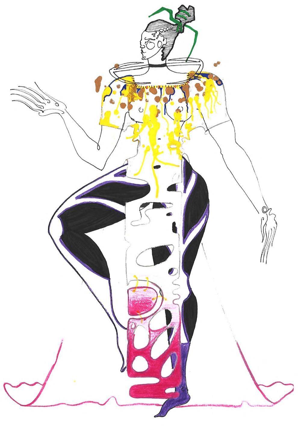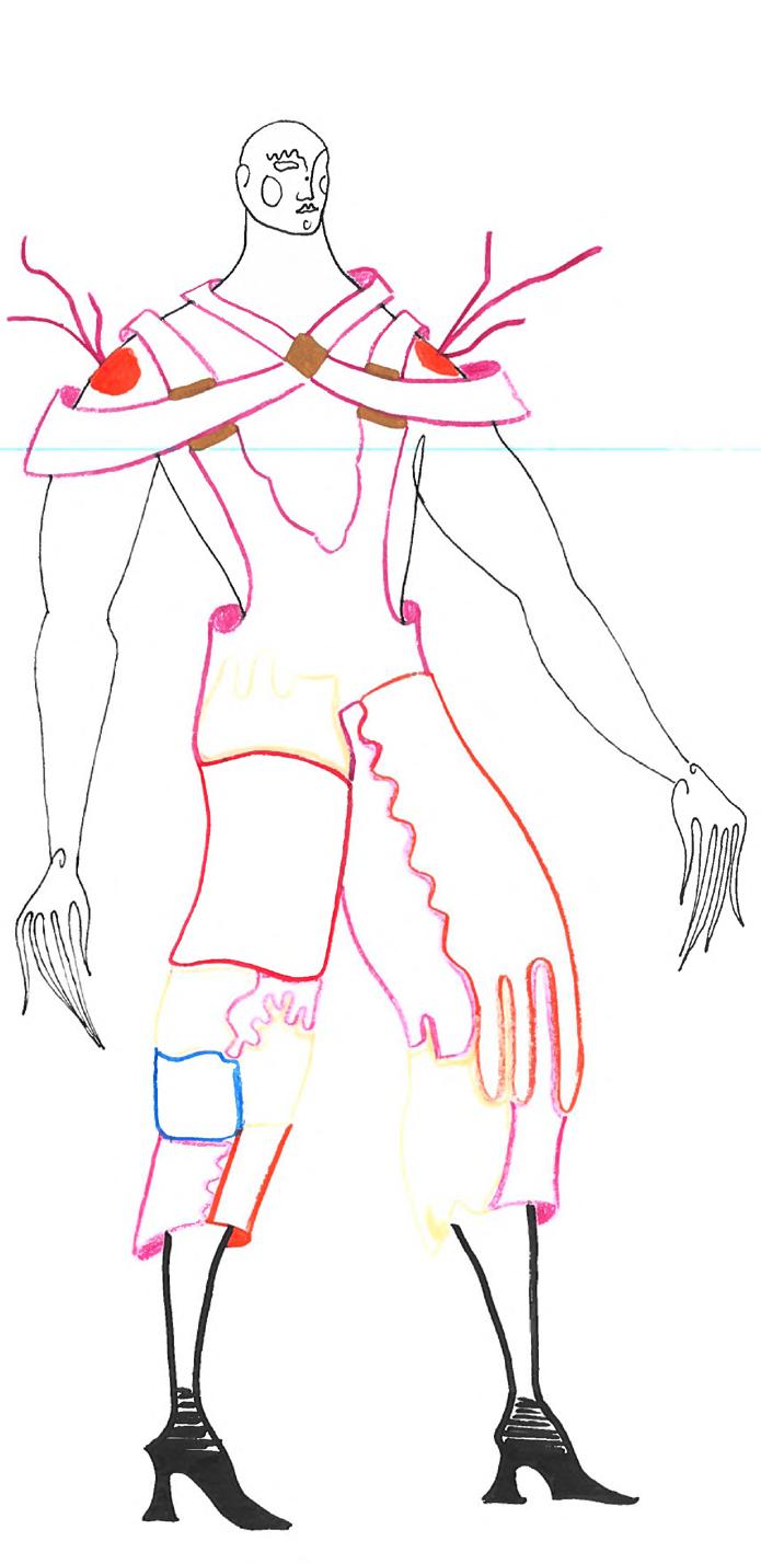 Nunca se pierde de vista el aspecto ficticio y escénico, con lo cual se pensaran los trajes para un escenario teatral, así, se recargará todo con prótesis bajo las prendas y telas particulares.