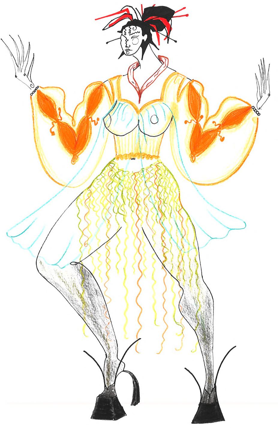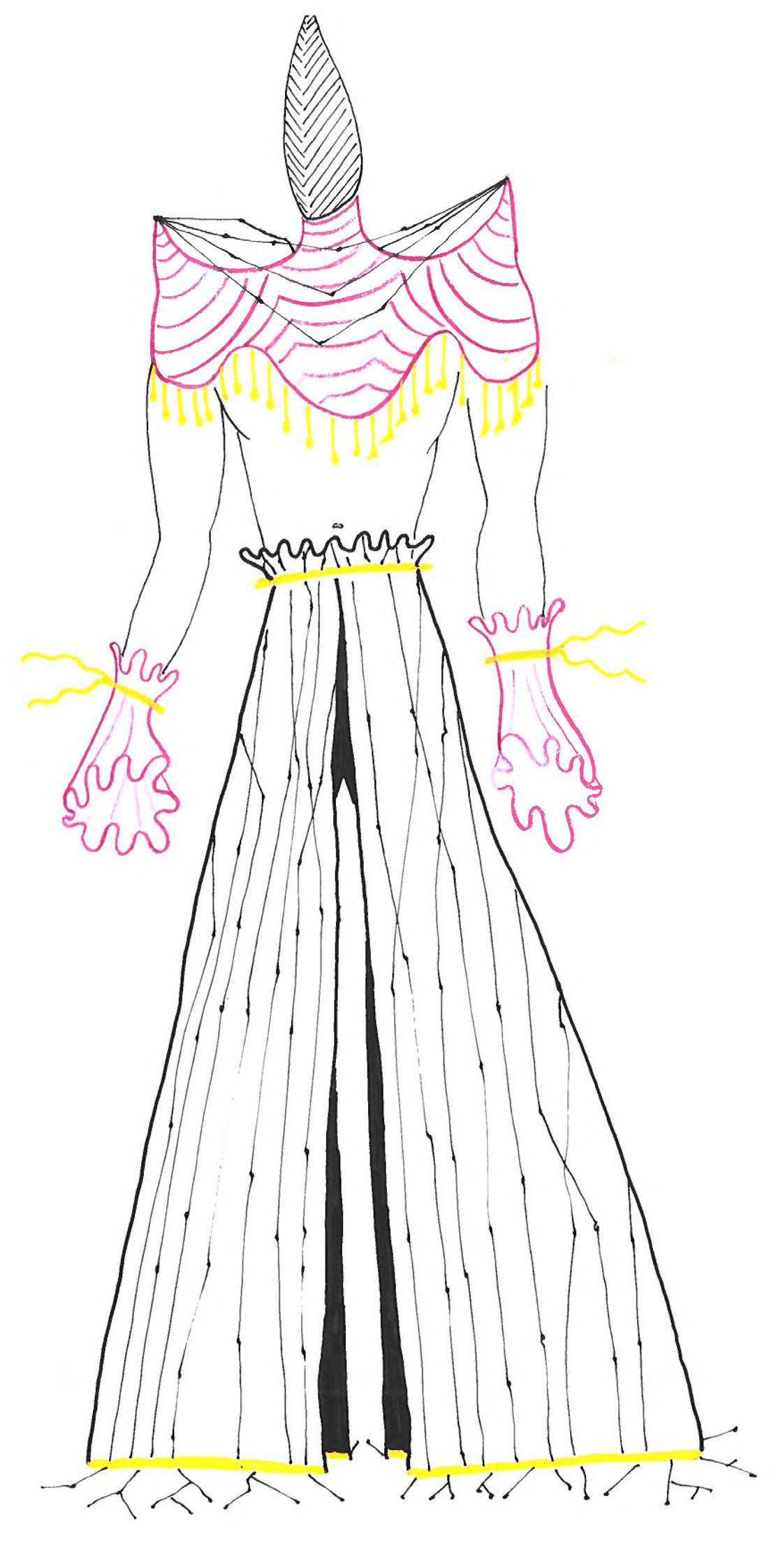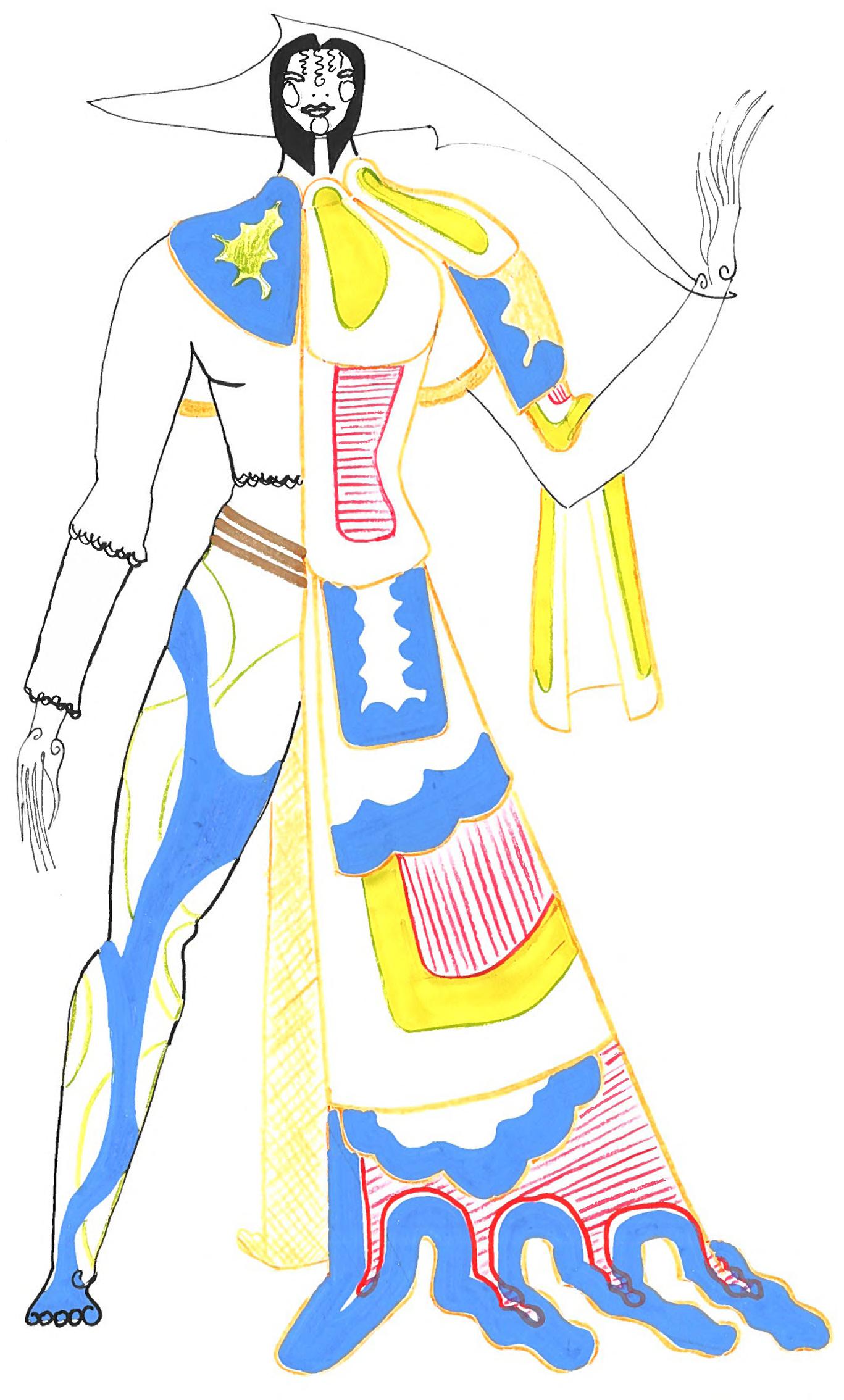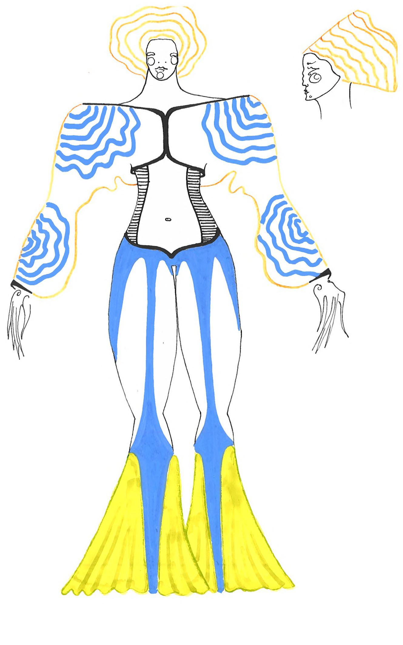 Esta idea nace básicamente de una visión personal, en la cuales se piensa a la movilidad o gestualidad de la persona en base a su atuendo (como un corsé que impide agacharse), se piensa también a aquel complemento para el cuerpo que permita la expresividad (como un abanico para una geisha) y llevar esta idea a una condición imprescindible, en el caso de esta obra se justifica como una necesidad biológica en los personajes. De este modo, inspirarse gráficamente y estilizadamente en la naturaleza o en un atuendo con semejanzas en algún elemento de la naturaleza.