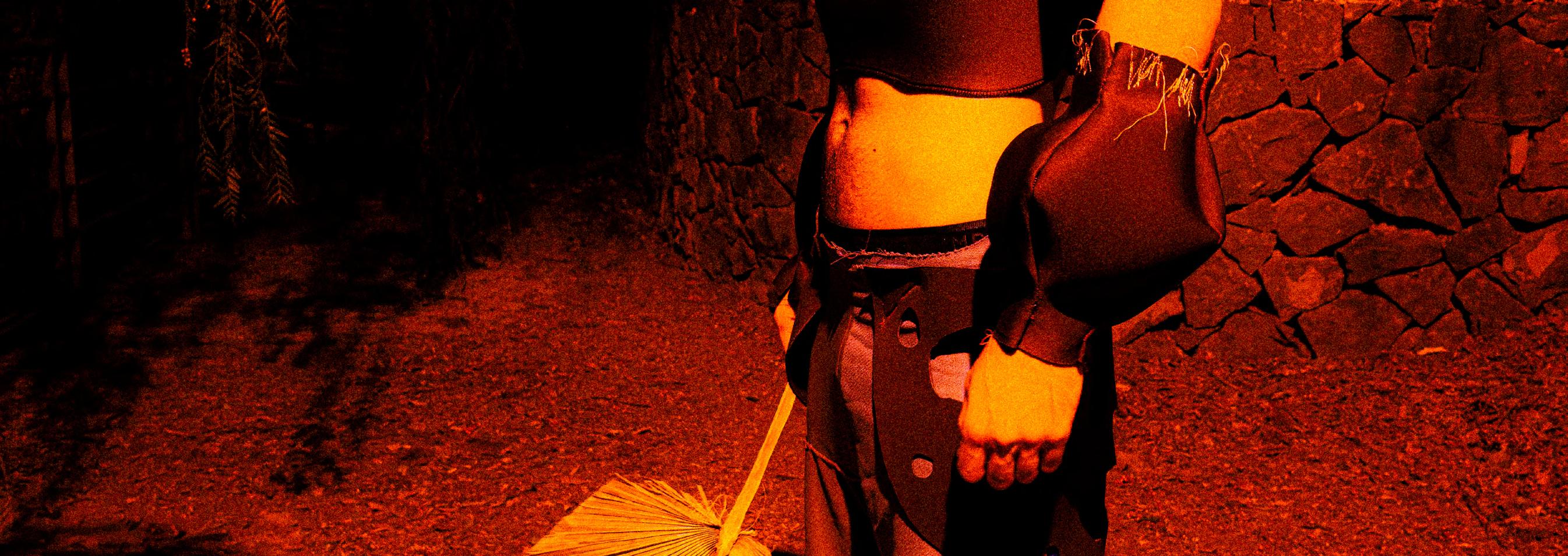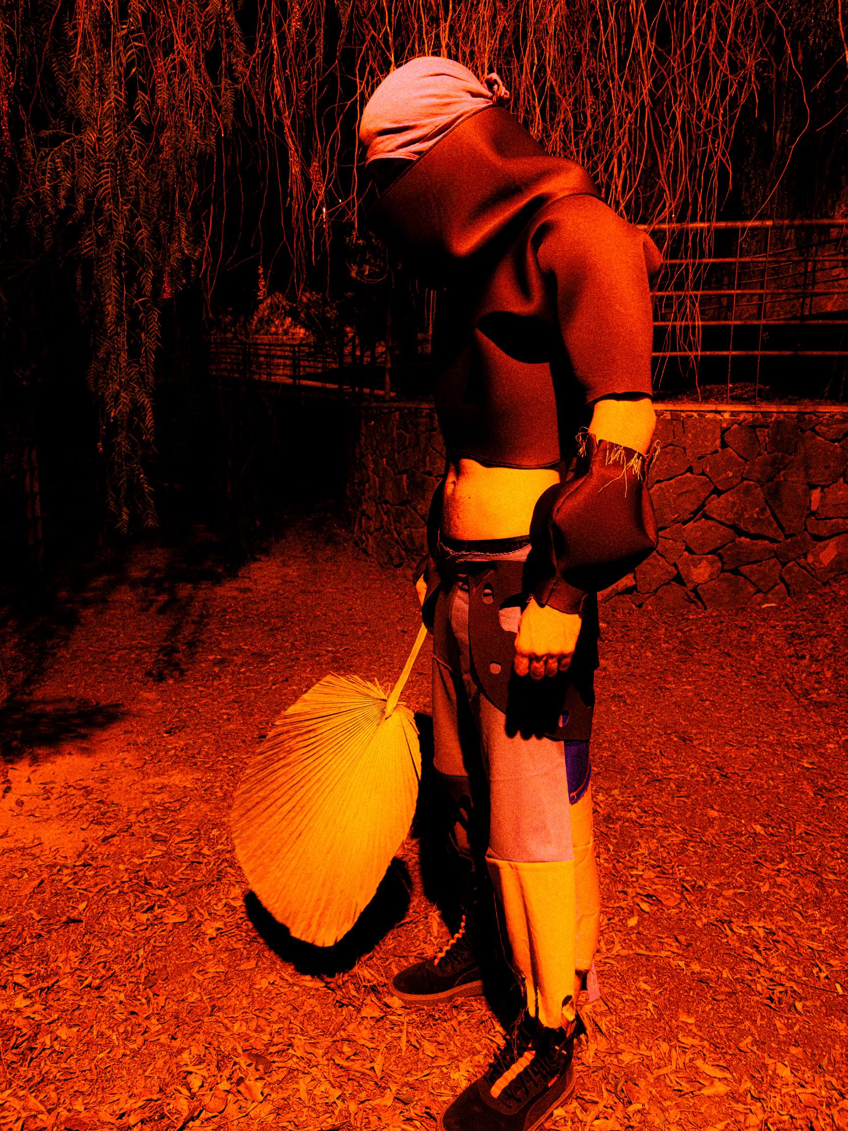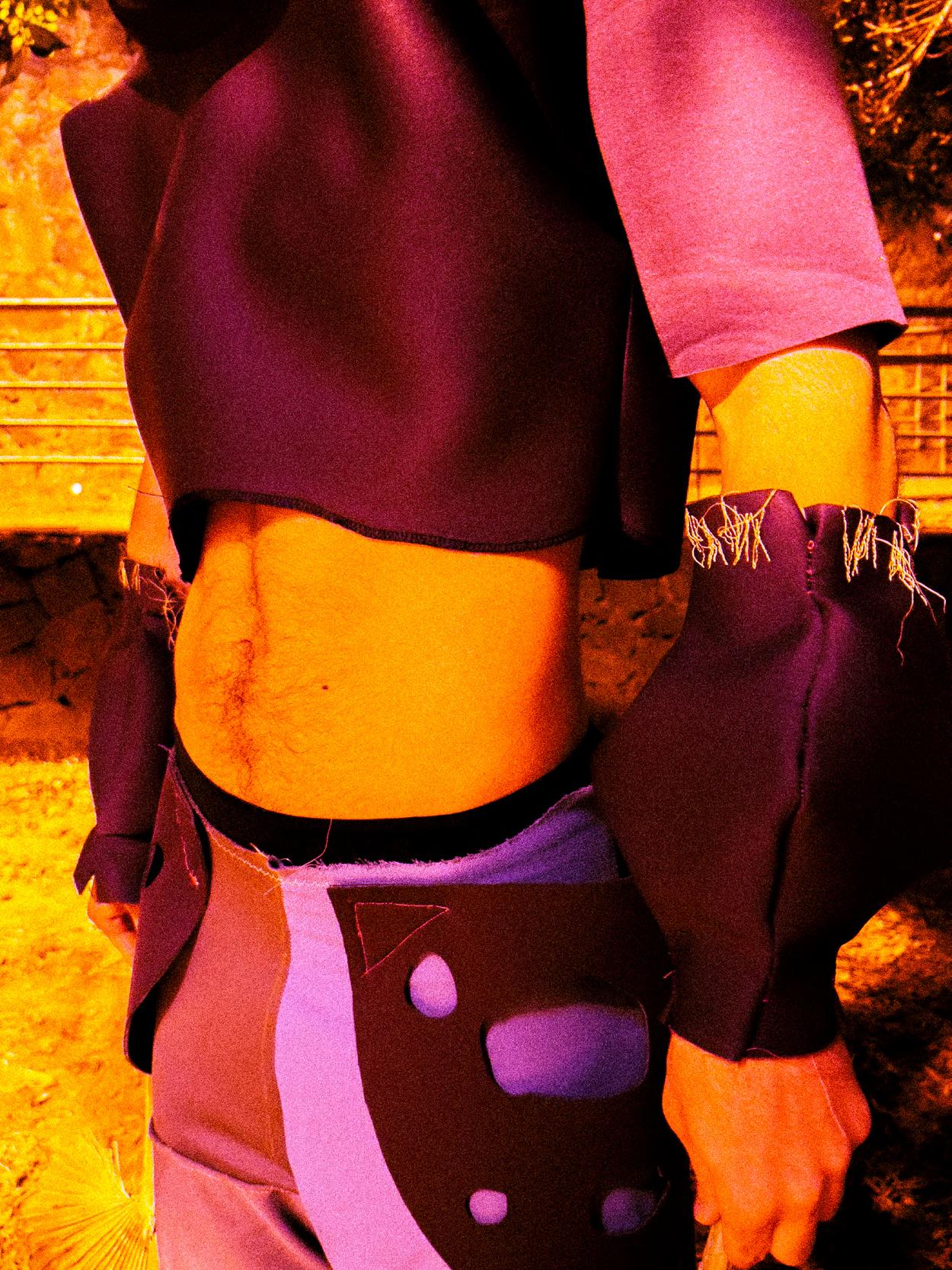ESTE TOP PERTENECE A LA QUINTA ESCENA DE NUESTRA REINTERPRETACIÓN. GRACIAS AL NEOPRENO QUE COMPONE ESTA PIEZA, ESTA SE AJUSTA AL USUARIO POR LAS MANGAS Y POR EL BORDE INFERIOR DEJANDO QUE EL TORSO TOME GRANDES PLIEGUES NATURALES TÍPICOS DE ESTE GRUESO MATERIAL, EL CUELLO INTERISO Y EN FORMA CÓNICA DEBE CUBRIR 3/4 DEL ROSTRO (HASTA LOS PÓMULOS) PARA GARANTIZAR SU FUNSIÓN DE PRENDA PARA EL ANONIMATO.