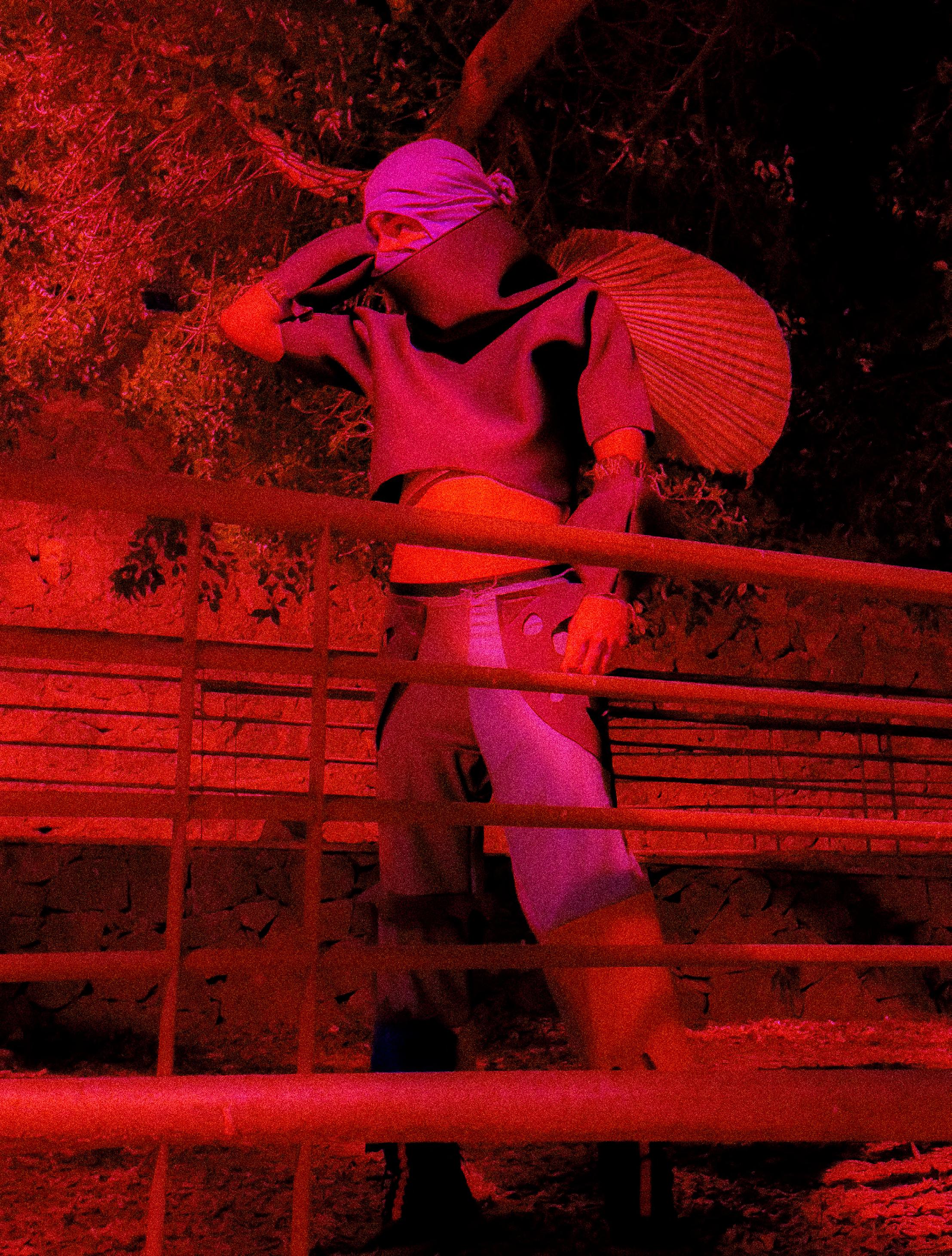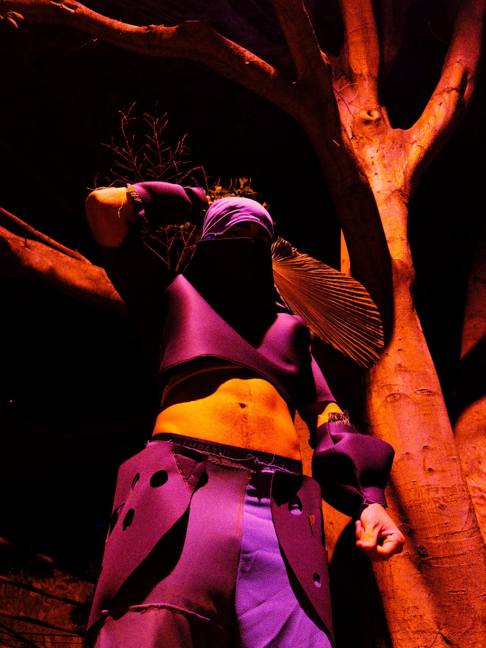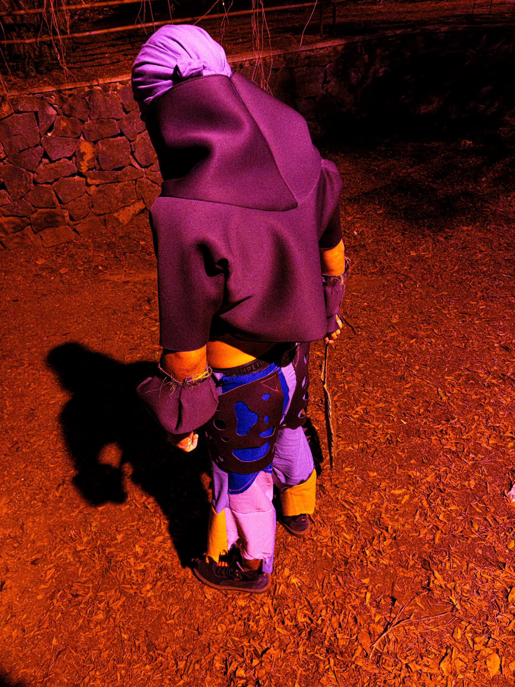 ESTE TOP PERTENECE A LA QUINTA ESCENA DE NUESTRA REINTERPRETACIÓN. GRACIAS AL NEOPRENO QUE COMPONE ESTA PIEZA, ESTA SE AJUSTA AL USUARIO POR LAS MANGAS Y POR EL BORDE INFERIOR DEJANDO QUE EL TORSO TOME GRANDES PLIEGUES NATURALES TÍPICOS DE ESTE GRUESO MATERIAL, EL CUELLO INTERISO Y EN FORMA CÓNICA DEBE CUBRIR 3/4 DEL ROSTRO (HASTA LOS PÓMULOS) PARA GARANTIZAR SU FUNSIÓN DE PRENDA PARA EL ANONIMATO.