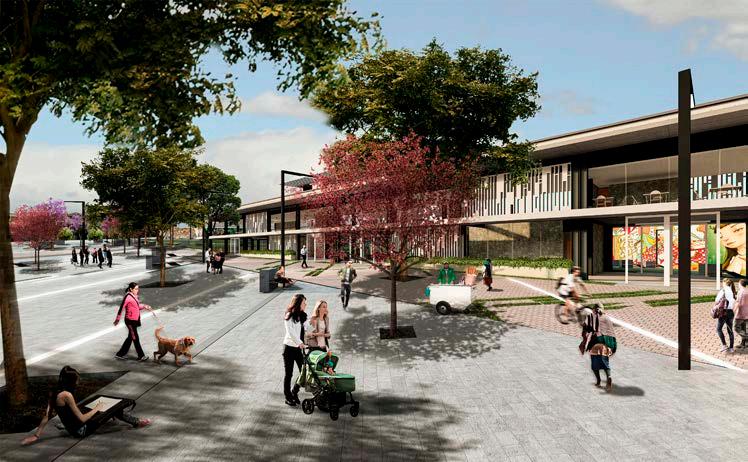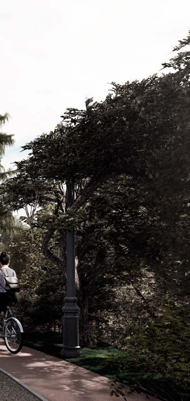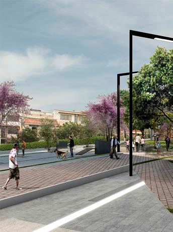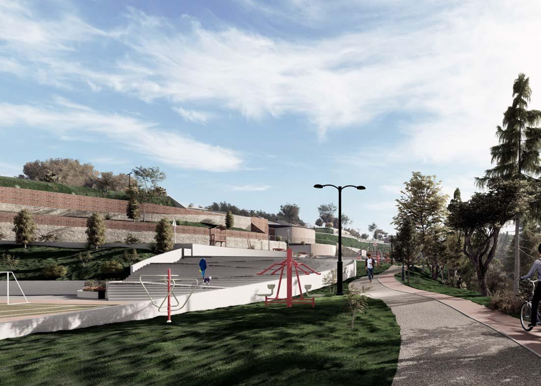 En esta perspectiva desde el límite norte del proyecto se aprecia en primer plano la actividad deportiva que pueden realizar los usuarios, mediante la caminería y la ciclovía que conectan todo el proyecto. Además se visualiza el muro que delimita la plaza a nivel 9.00 el cual permite espacios con mobiliario de descanso.