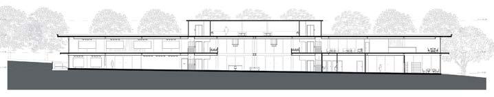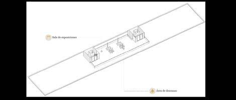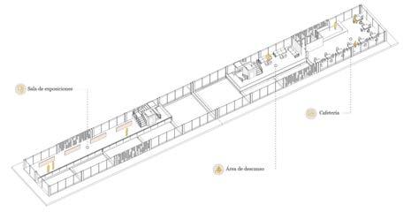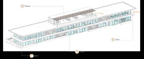 Por otra parte, se dispone un bloque de estructura metálica, con grandes ventanales en sus cuatro fachadas, proporcionando mayor iluminación en los ambientes; la aplicación de aleros para controlar la entrada de luz y radiación solar, así como enmarcar estéticamente la horizontalidad del edificio. El programa se resuelve en dos plantas con dimensiones de 8m x 70m, dispuesto en una volumetría paralela a la diagonal principal, generando recorridos a través de vestíbulos y espacios a doble altura.
