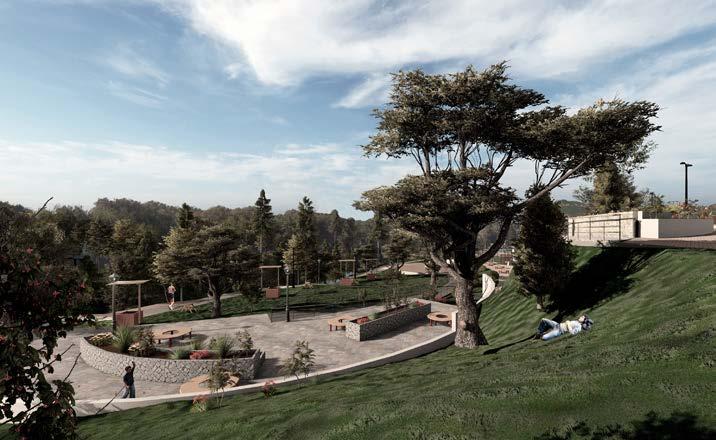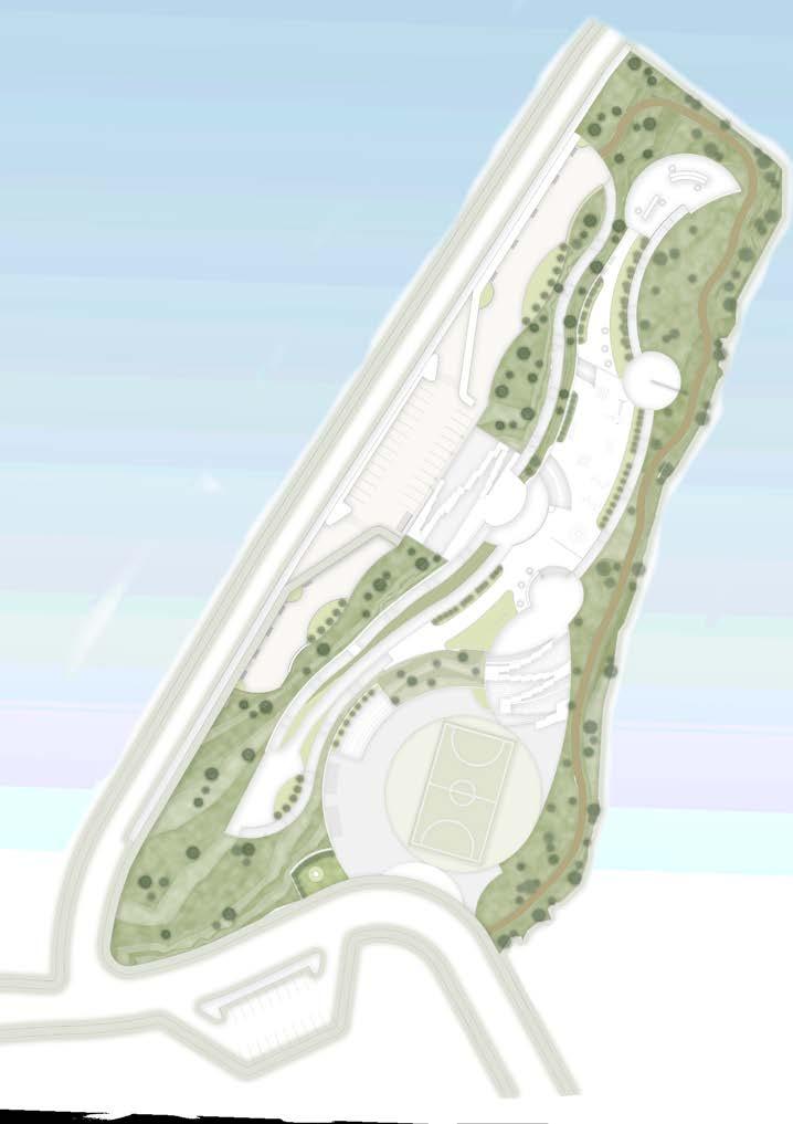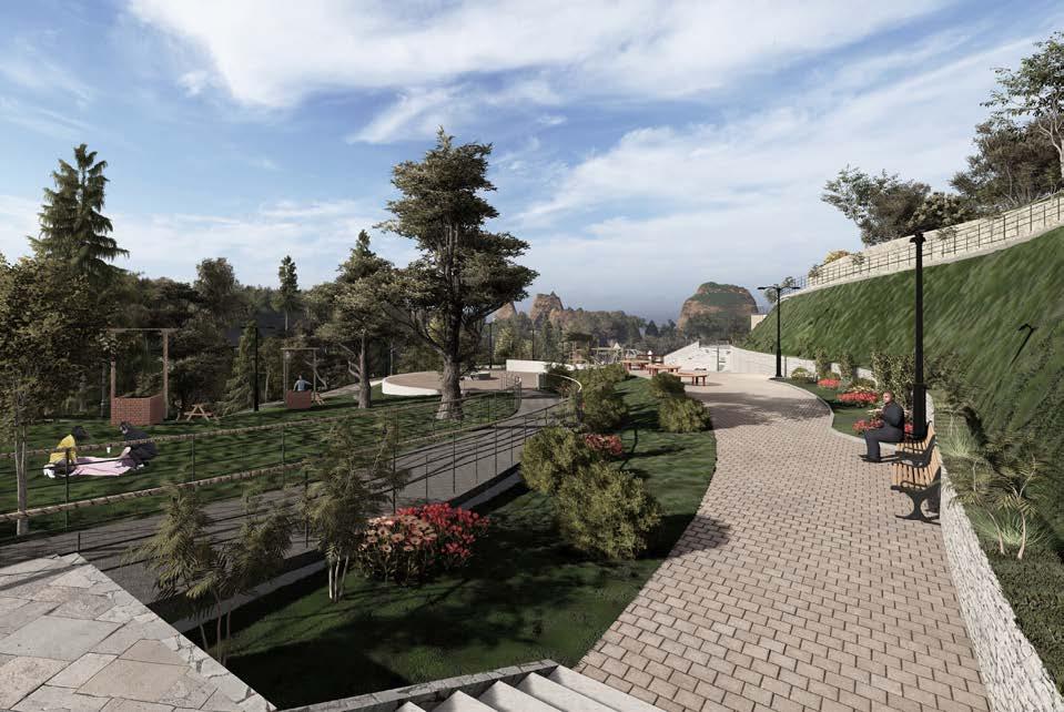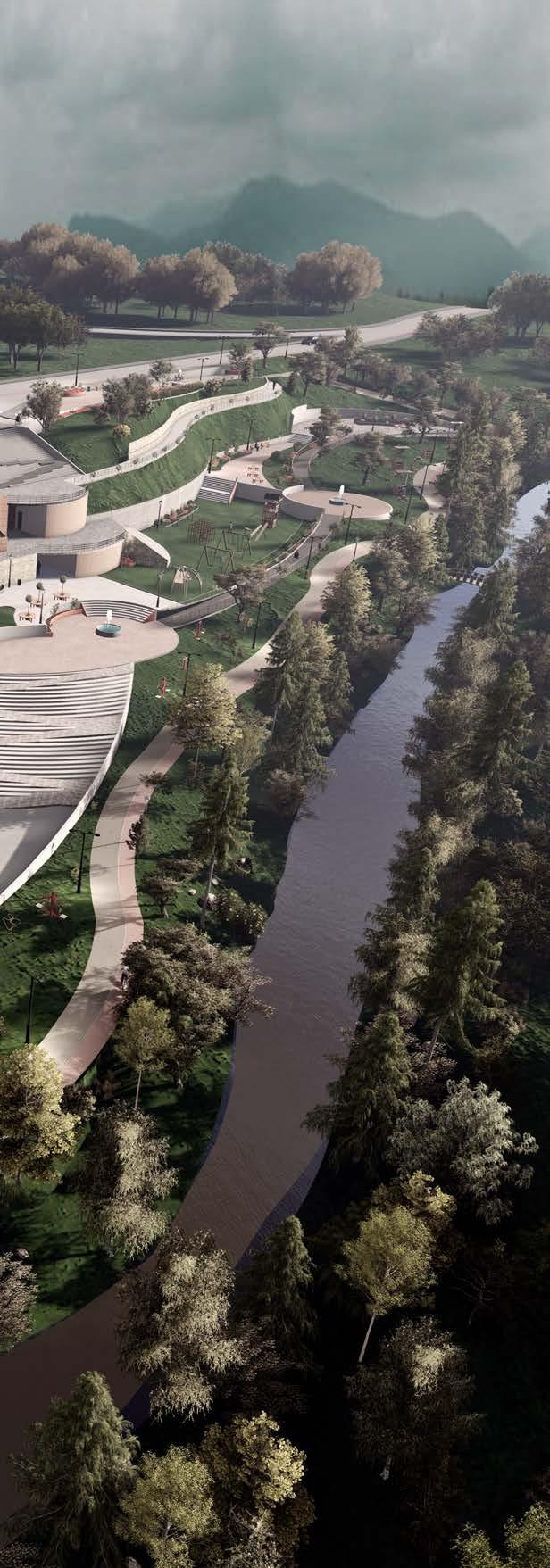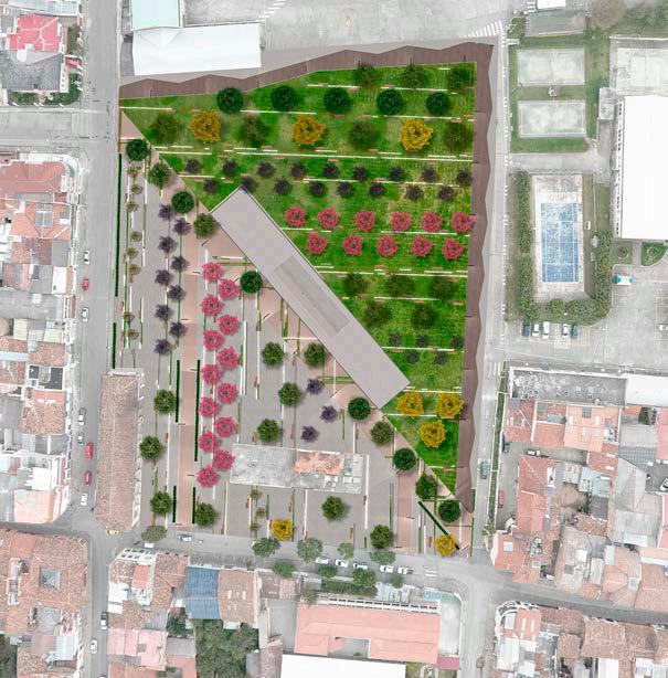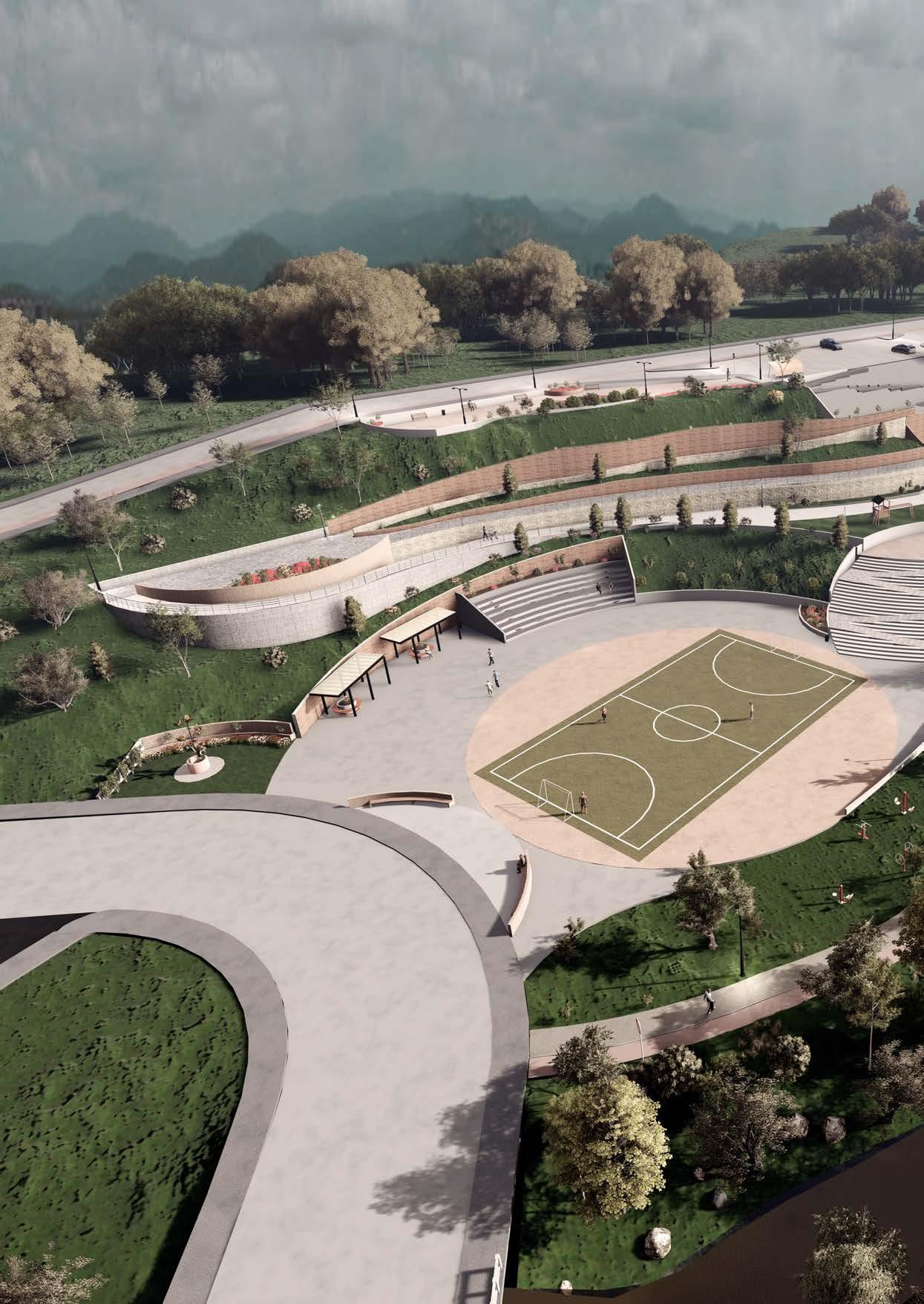 La perspectiva muestra los desniveles que existen en el parque, al tener una topografía irregular se propuso el uso de varias plataformas para mantener el dinamismo del proyecto. En los distribuidores de circulación se encuentran fuentes de agua para mejorar el ambiente y ser utilizado en fechas importantes como el carnaval.