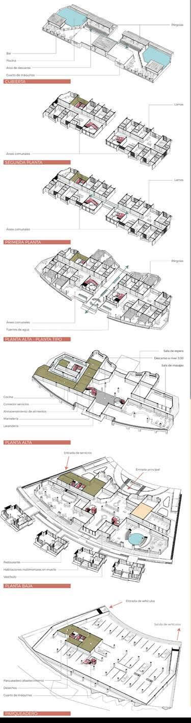 El área de servicio se ubica en una determinada zona el cual nace desde el subterráneo, mismo que cuenta con un espacio para el abastecimiento del hotel. En la planta baja existe una entrada para el personal de servicio junto con los vestuarios que se conecta a una circulación vertical exclusiva para servicios, permitiendo abastecer las diferentes zonas del hotel.