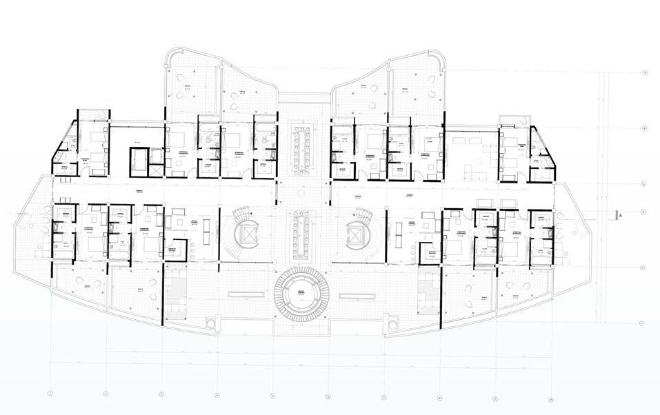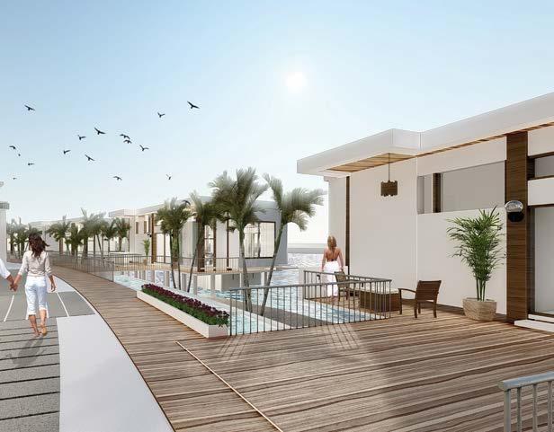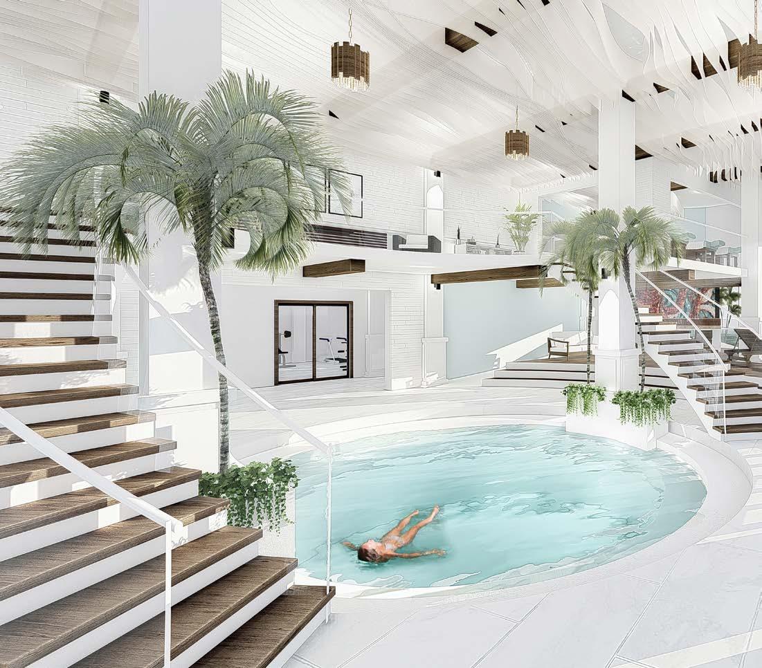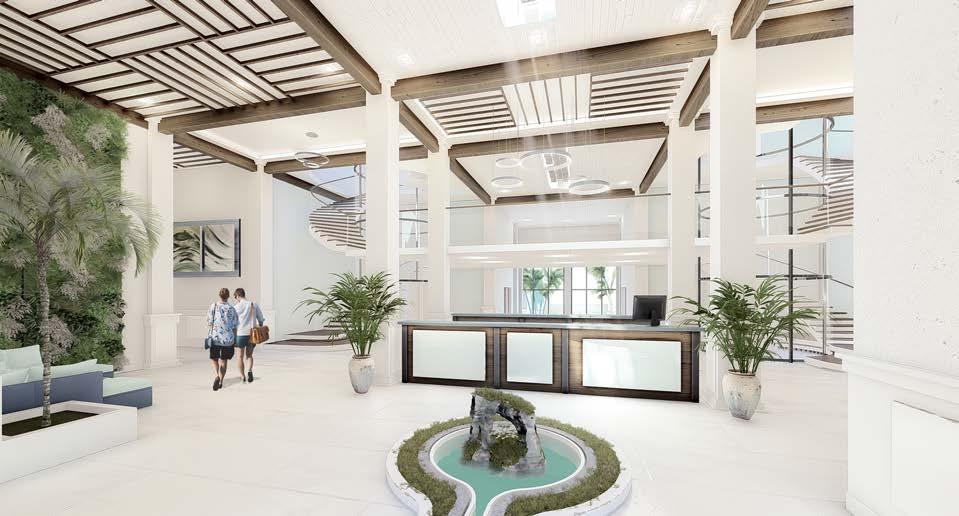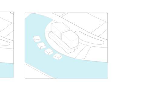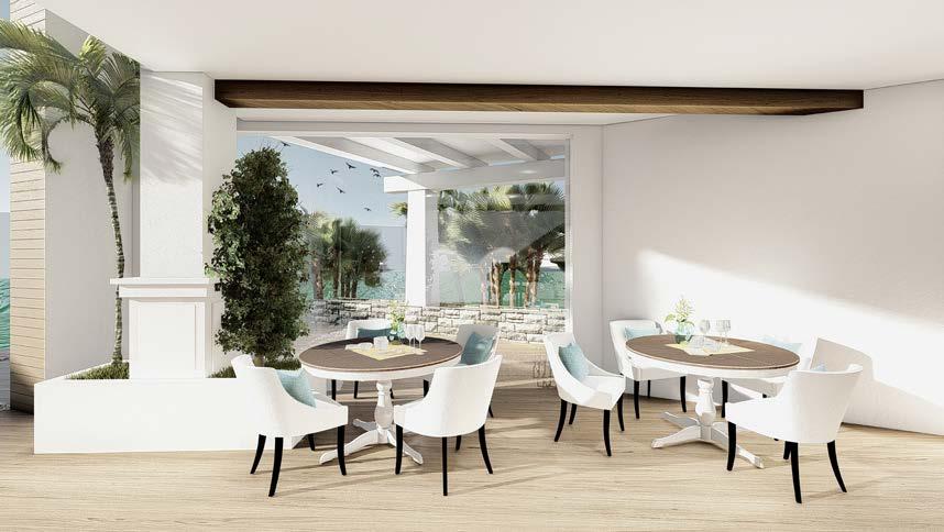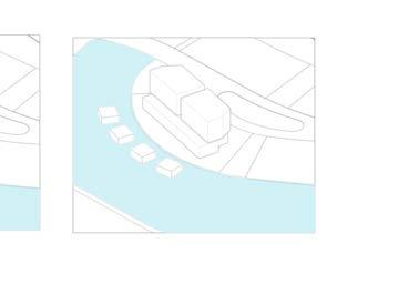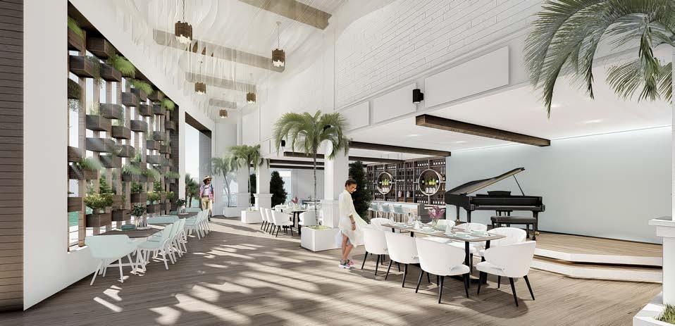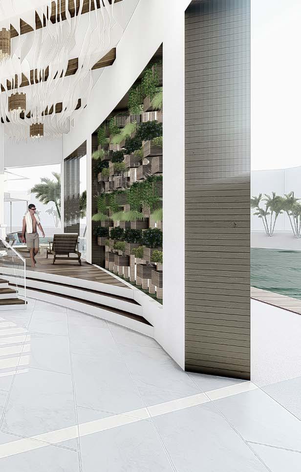 El vestíbulo a doble altura conecta dos ejes que ubican a la recepción en la mitad, permitiendo tener visibilidad de las entradas y salidas. El restaurante ubicado con visuales hacia el agua y muelle, su doble altura permite una ventilación adecuada en el lugar. Mientras que se ubica frente al muelle para aprovechar las visuales.