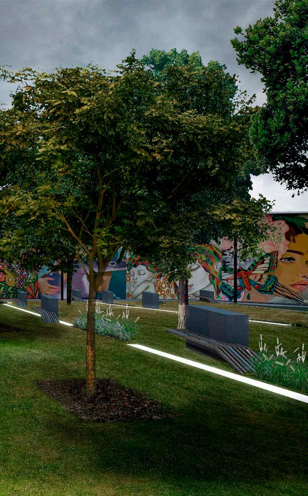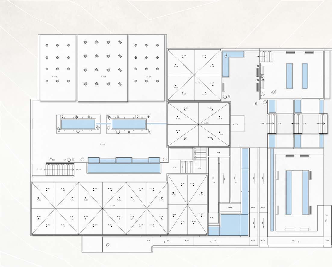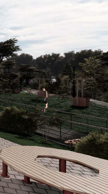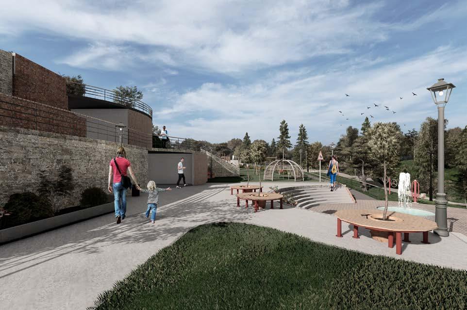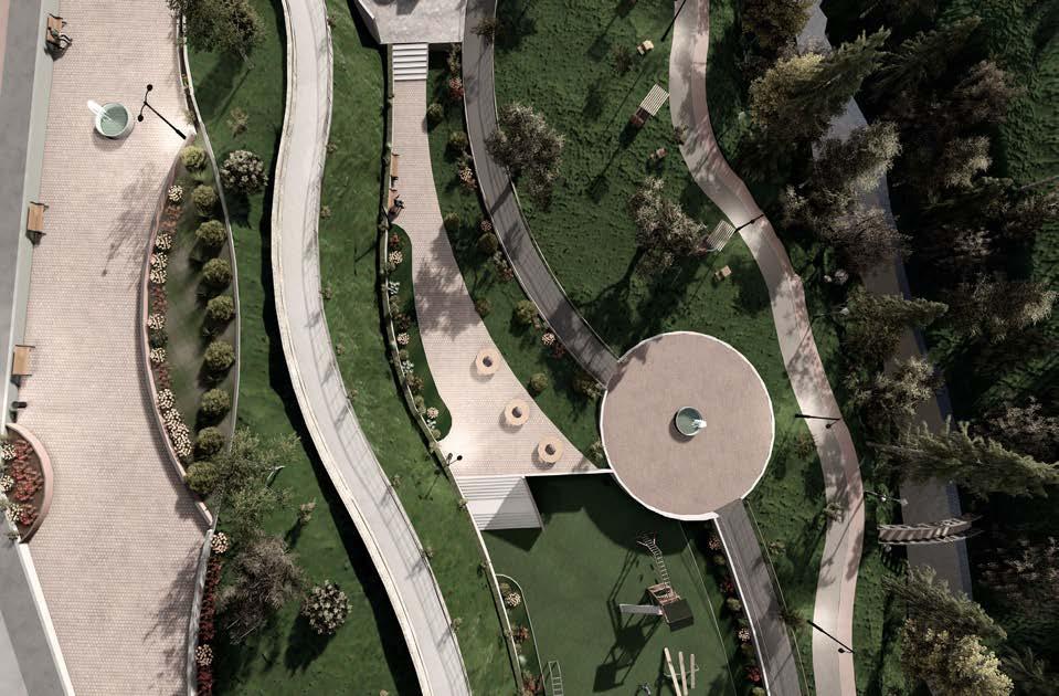 En este espacio ubicado a nivel 4 se encuentra una pileta en la mitad de la plaza circular, permitiendo una mayor acogida para los usuarios. La siguiente plataforma en la zona infantil en donde se puede visualizar juegos rodeados de césped para mayor seguridad de los niños, además de moviliario de descanso para el control por parte de los padres.