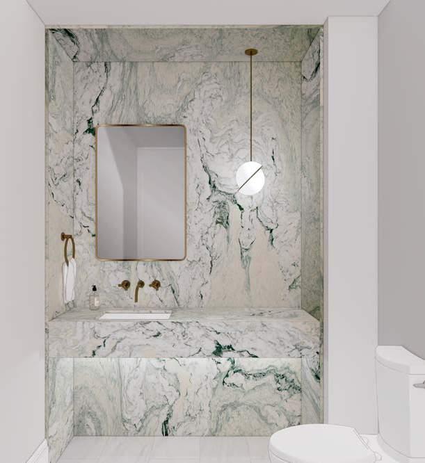 portfolio 2022 ff&e presentations Powder room + Secondary Bath material boards PHASE CONTRIBUTION: + Concept Presentation + Design Development + Construction Documentation MEDIUM: + Revit + InDesign + Photoshop 142 WEST 21ST STREET PAGE 47 FLOORS (12 X 24), VANITY TOP + TUB SURROUND (SLAB) BIANCO ALANUR, POLISHED MARBLE SECONDARY BATHROOM MATERIALS WAINSCOT SAVOY 12 X 12 LARGE STACK CERAMIC MOSAIC TILE RICE PAPER ANN SACKS WALL SCONCE BANDA 24 NATURAL BRASS 142 WEST 21ST STREET 6/15/22 PAGE 50 POWDER ROOM MATERIALS + RENDERING VANITY WALL CIPOLLINO MARBLE FIELD TILE, HONED ARTISTIC TILE, 12” X 24” X 3/8” PENDANT MINI CRESCENT BY LEE BROOM BOYD LIGHTING FLOOR BIANCO ALANUR 12 X 24 STONESOURCE VANITY MIRROR 24X36 DEEL FRAME RECTANGULAR BRASS FINISH - E6254 REJUVENATION 142 WEST 21ST STREET 05/10/22 PAGE 43 TYPICAL SECONDARY BATHROOM VIEW + PLAN 5'-9 1/4" 9'-3 7/8" 2'-8" 1'-11 3/4" 6" PAGE 50 RENDERING