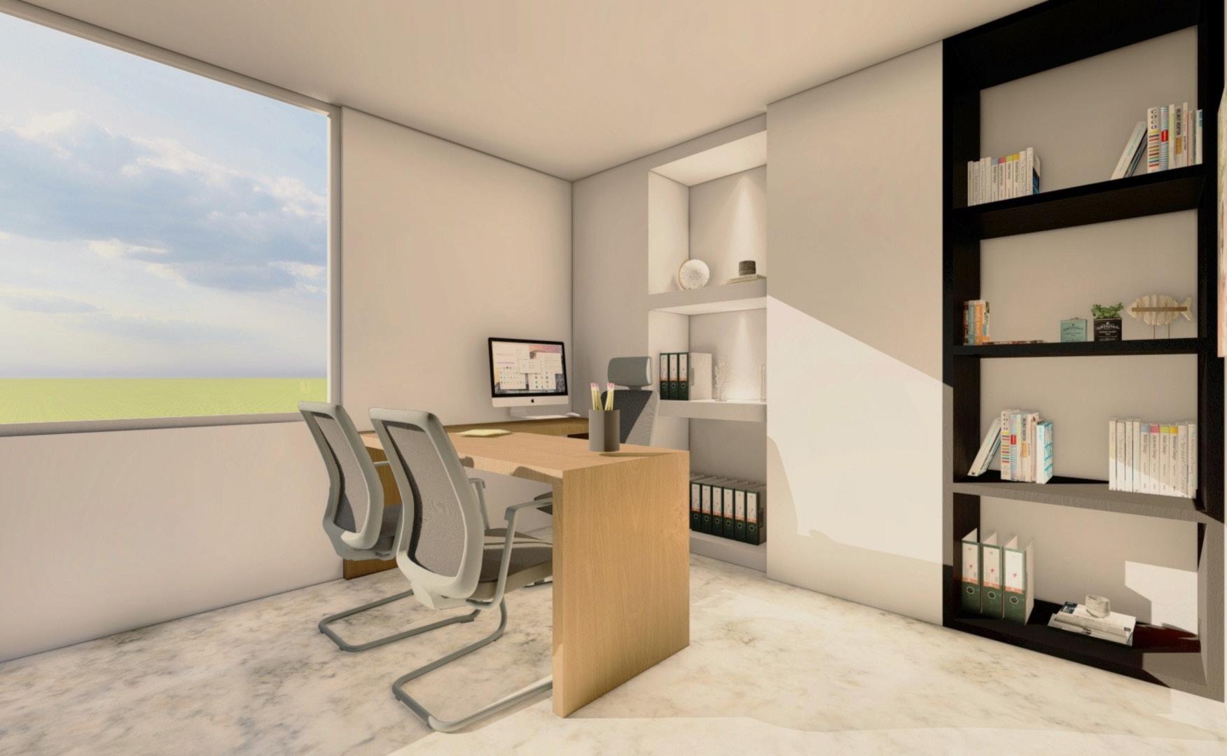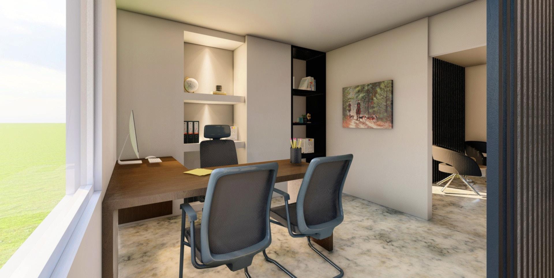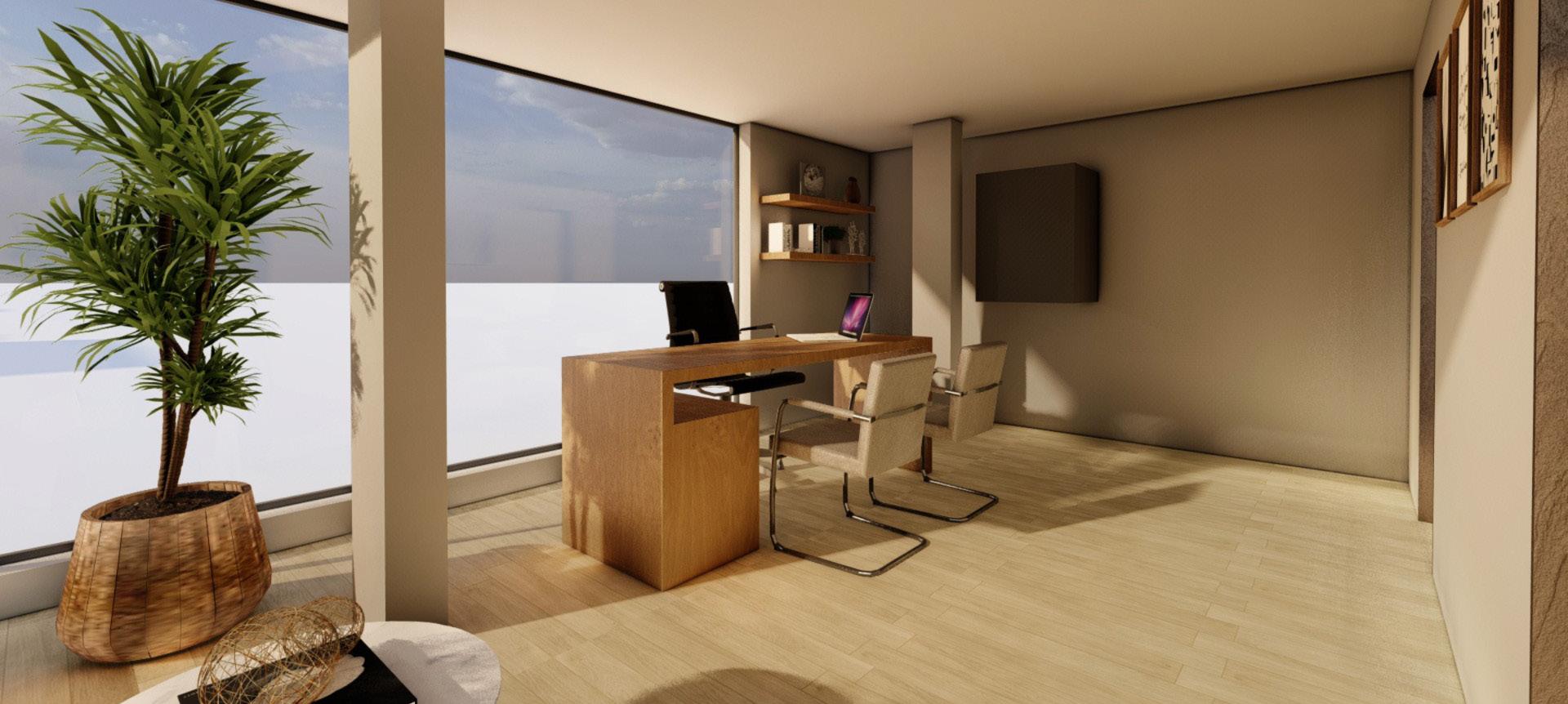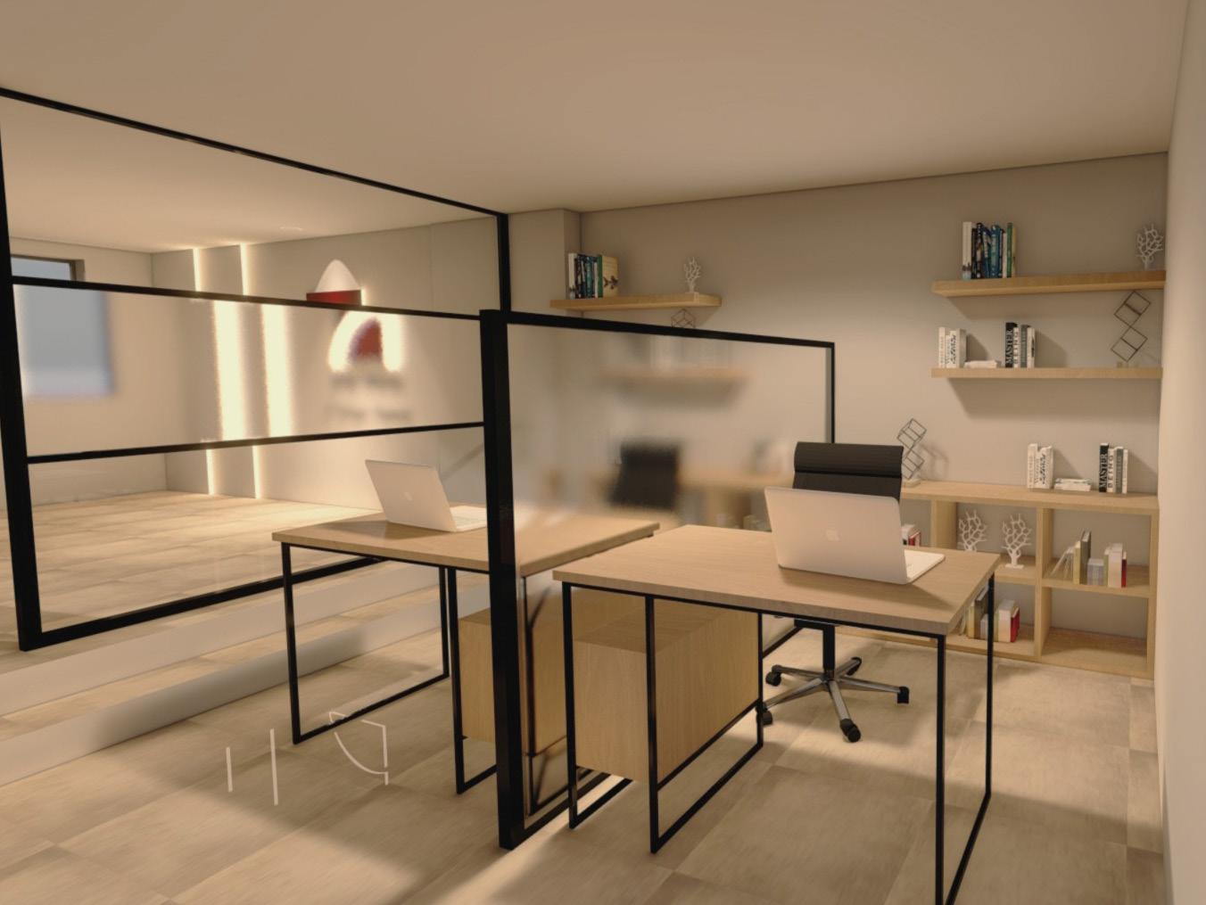 Esta ofina de abogados cuenta con recepción, sala de espera, oficina principal, área de pasantes, sala de reuniones equipada y oficinas privadas para abogados, todo diseñado para un entorno profesional y eficiente.