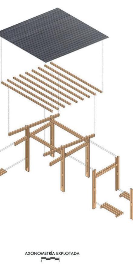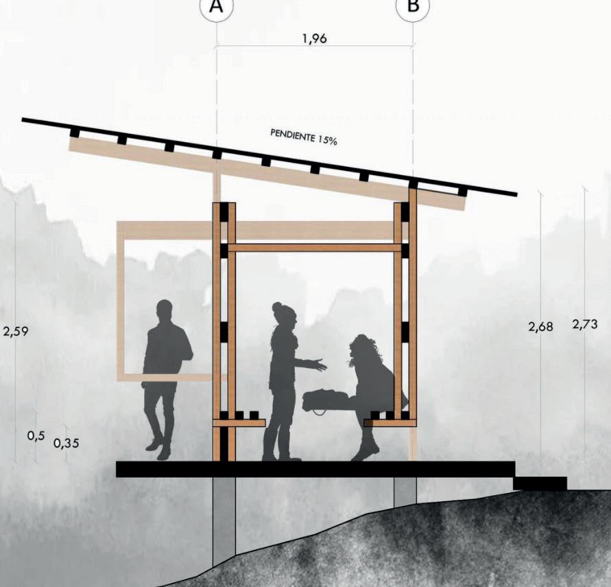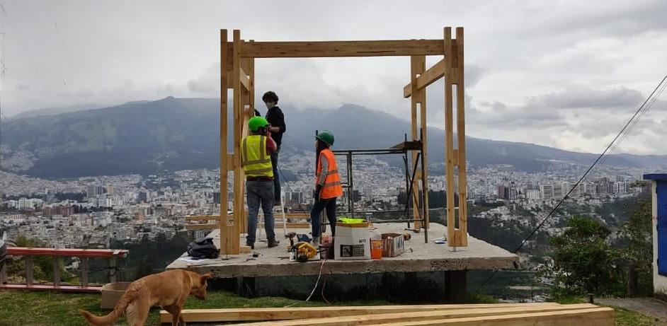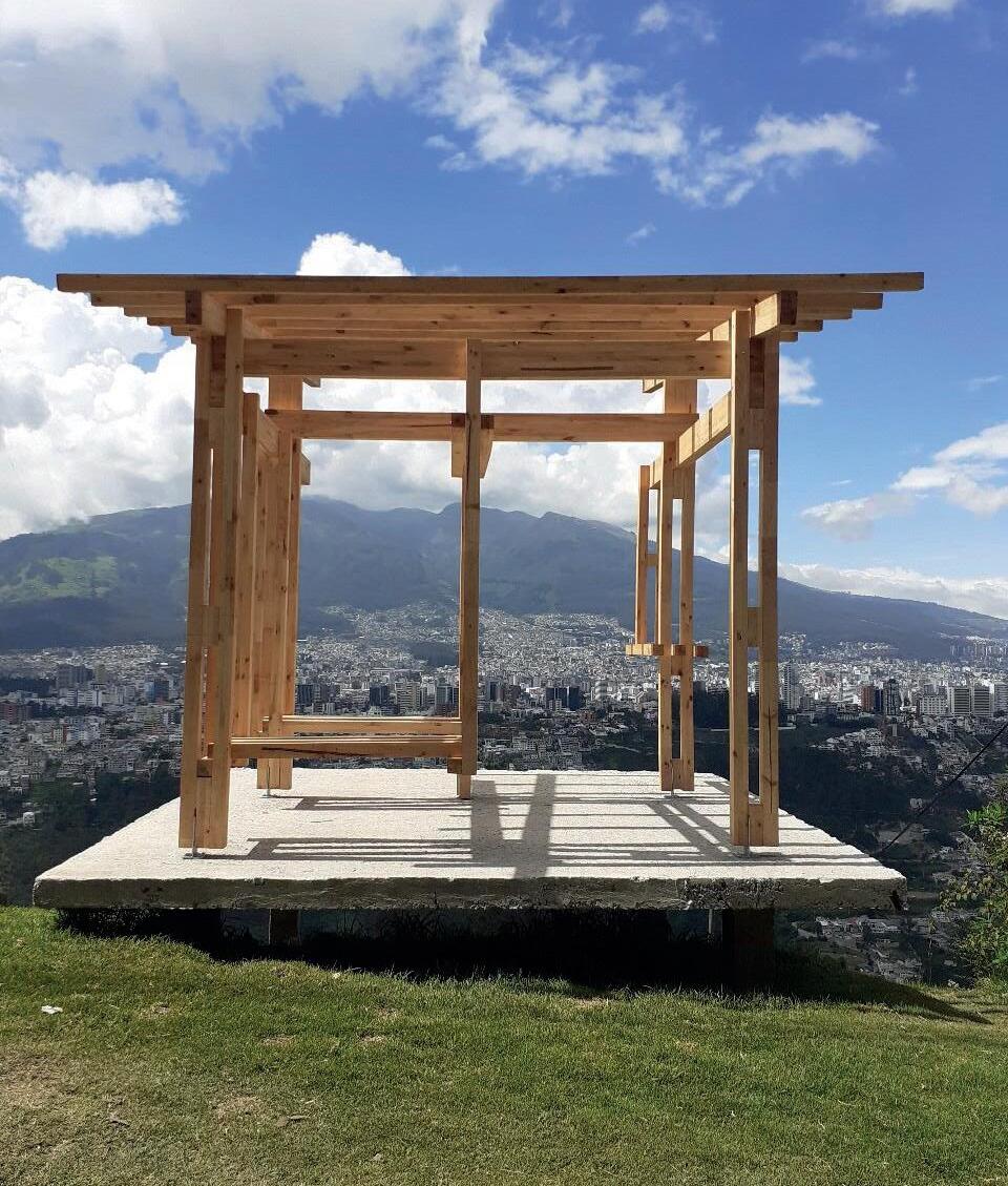 El proyecto “Parada-Mirador INSITU” surgió para ofrecer un espacio cubierto en el barrio San Francisco de Miravalle, en una zona de alta afluencia. La estructura, ligera y sobria, se levantó sobre una plataforma de hormigón construida por la comunidad, utilizando madera y acero, con columnas que elevan la cubierta para mantener el diseño formal