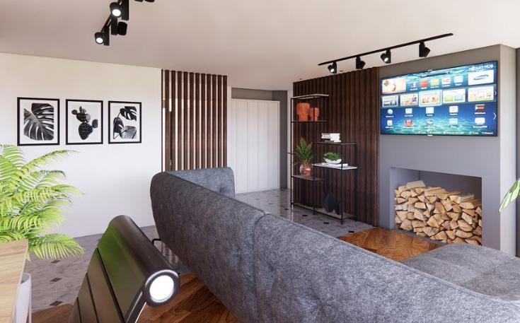 En la zona 3, se integra la cocina y comedor con una isla y chimenea compartida. En la zona 4, se crea un espacio privado en el estudio/sala de estar, manteniendo el piso original y añadiendo listones de madera y un espejo para generar un recibidor