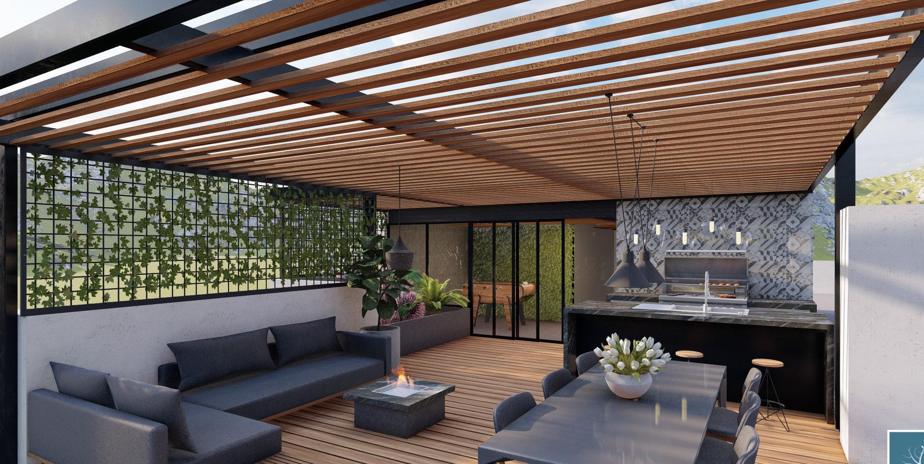 El objetivo del proyecto fue crear un espacio comunal para que los propietarios del edificio pudieran reunirse y relajarse con sus seres queridos. El área, deteriorada, se transformó en un espacio de parrillada y estancia, con una sala de estar que cuenta con iluminación natural, vegetación y vanos abiertos.