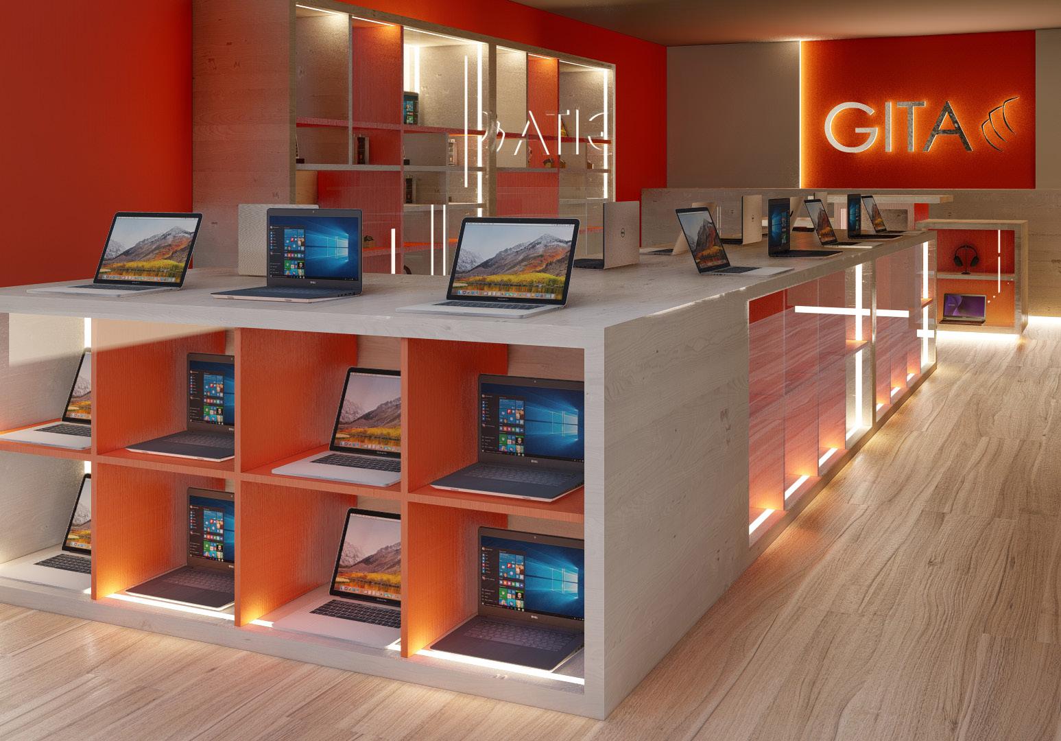 Este diseño para un local está enfocado en un concepto simple y minimalista que resalte los colores del logo, creando un espacio moderno y atractivo. El mobiliario incluye mesas lineales para la exhibición de laptops, un counter de pago estratégico y espacios dedicados para celulares, consolas, accesorios, y tecnología como relojes inteligentes.