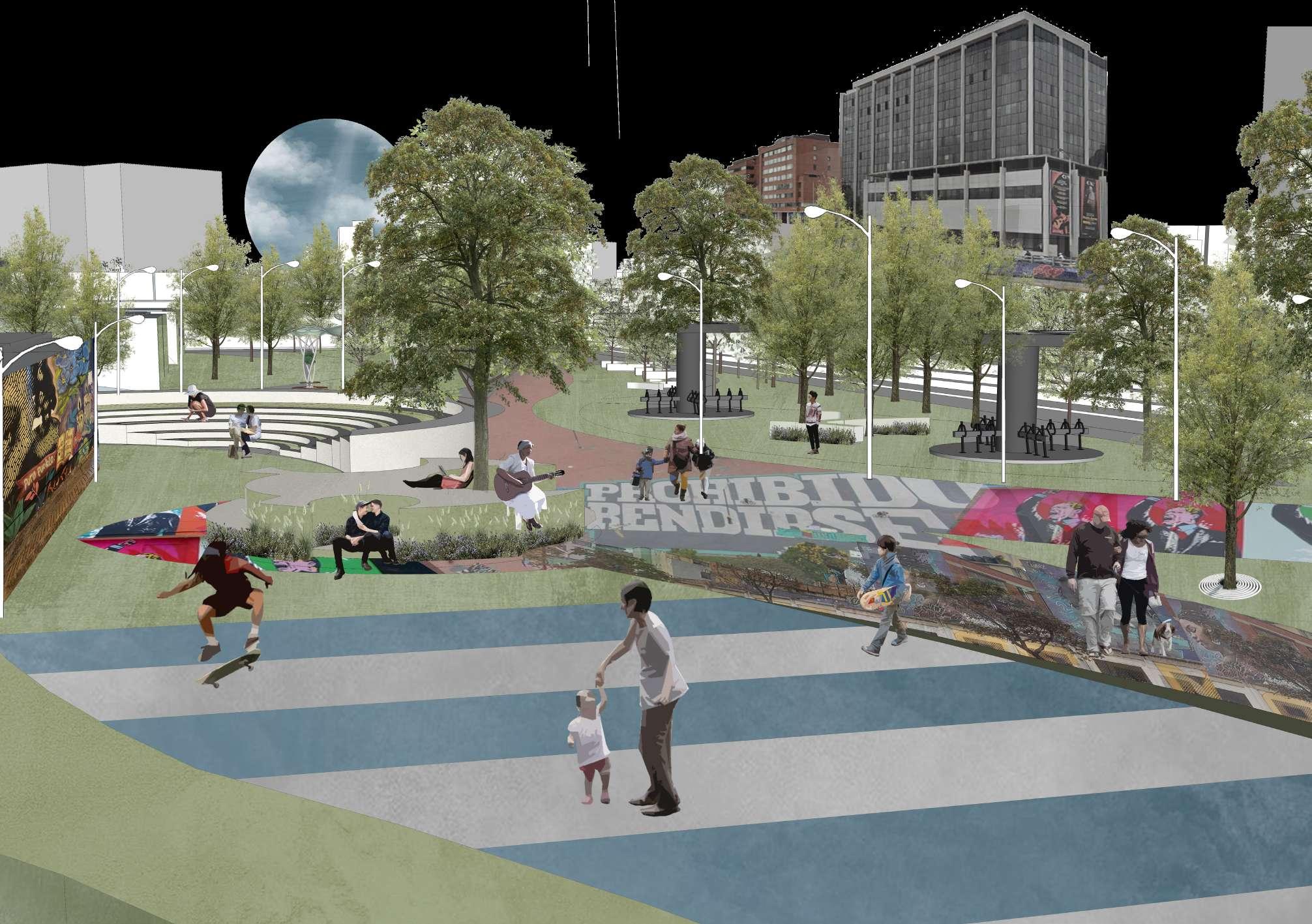 Este diseño de espacio implica desarrollar una propuesta centrada en la apropiación de este mediante intervenciones artísticas, activación comercial, actividades lúdicas y el disfrute de zonas verdes que fomenten diálogos, descanso e integración de los espacios de hitos de memoria e historia.