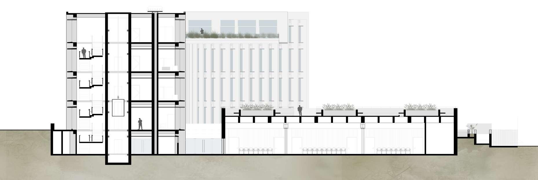 Estas representaciones ofrecen una visión detallada del diseño: los cortes revelan la distribución interna y la relación entre los niveles, las fachadas muestran la integración del edificio con su entorno, y las perspectivas fotográficas proporcionan una vista tridimensional completa.