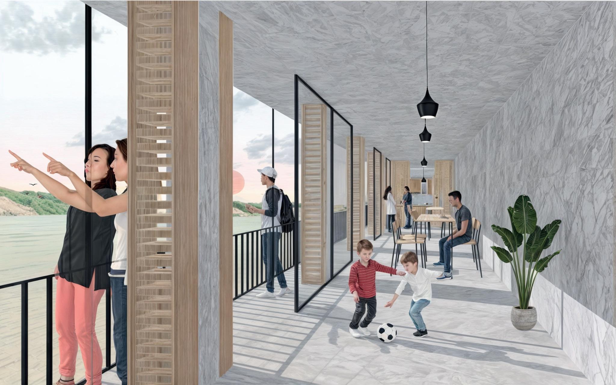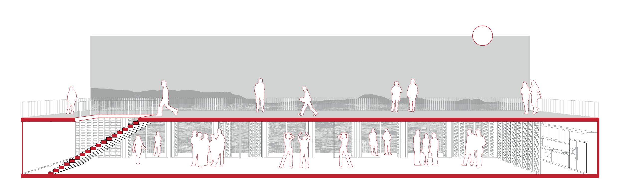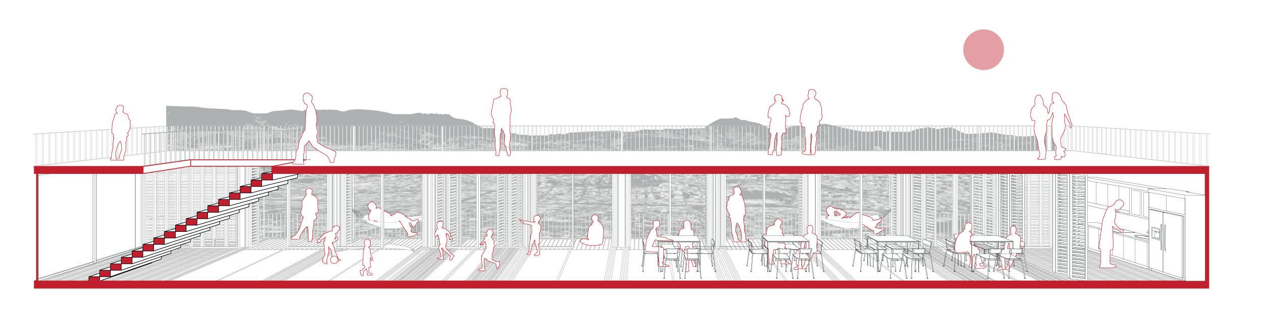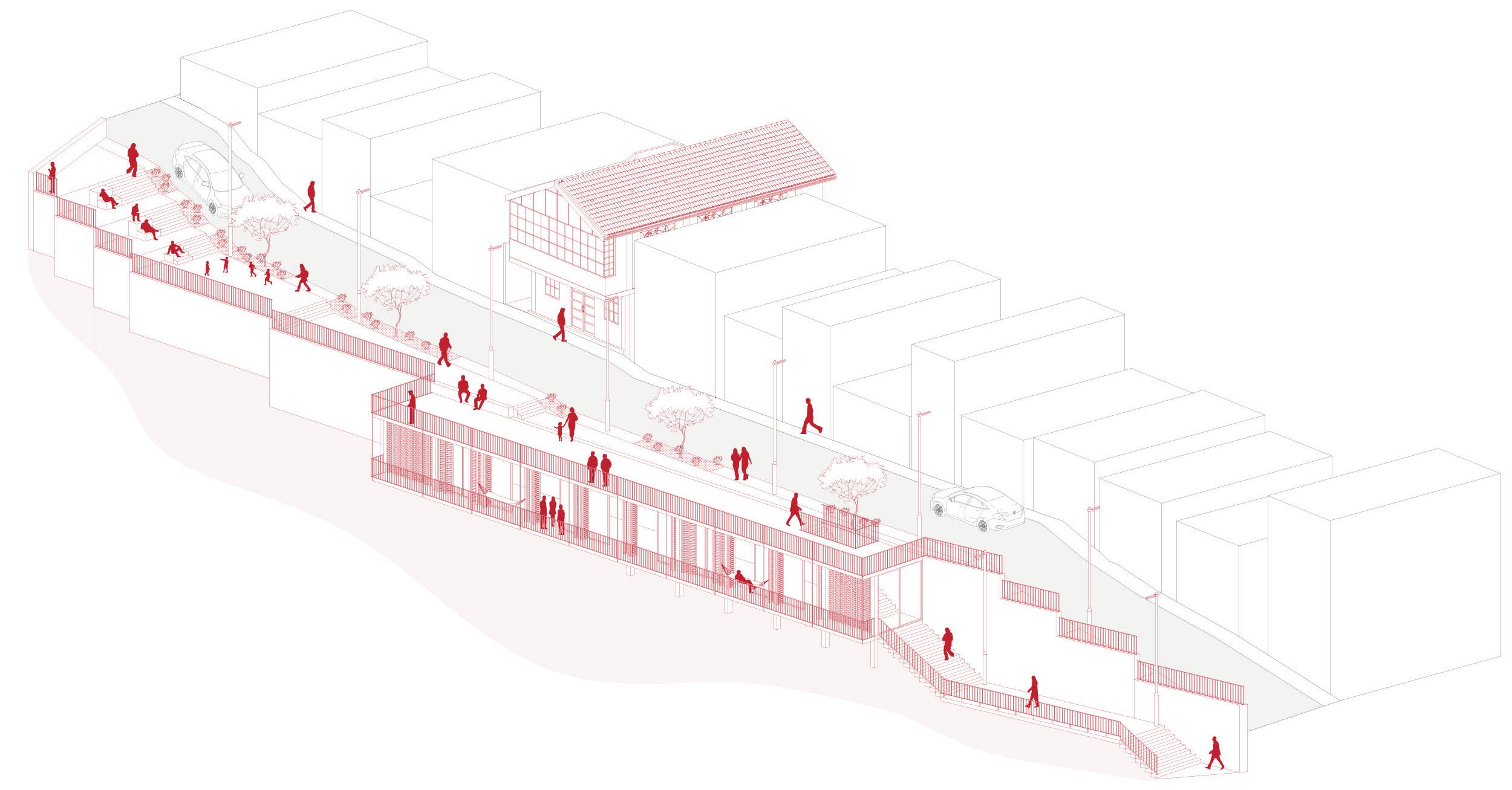 Adaptándose a la pendiente, se crea una plataforma al nivel de la calle, y hacia abajo un volado habitable que podrá ser usado para varias actividades. Los habitantes del barrio podrán usar este espacio para realizar actividades comunes y de formación deportiva o educativa, ya sea bailo terapia, talleres o demás. Una cocina común permite también que los moradores puedan usarlo como punto de encuentro. Pero también la intención de este espacio es que pueda ser un lugar que se pueda alquilar para otros actos como eventos sociales, generando así ingresos para la junta comunal para que así puedan cubrir gastos de servicios básicos o reformas del equipamiento e infraestructura existente.