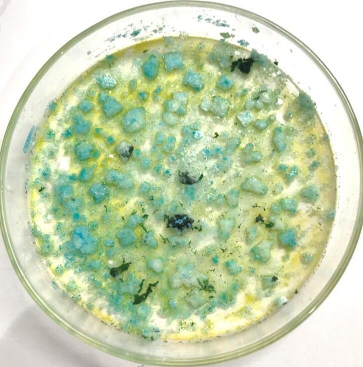 Green dye, in saturated saline solution created larger, less uniform crystals. Dye split to reveal yellow which moved outwards in wave pattern.