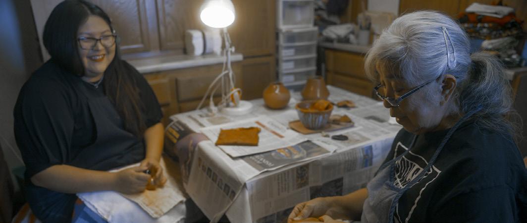 which mentorship forms the heart. The Gonzales family thrives through artistic exchange from one generation to the next. Barbara Gonzales (San Ildefonso Pueblo), the Martinezes’ great-granddaughter, carries on blackware pottery, in her greatgrandparents’ most known style of “black-on-black” and in an etched design variety. To honor the necessity of water and conveying messages to ancestors through the clouds, she inscribes spiders and hummingbirds, with inlaid stones of turquoise and coral. Barbara’s son Cavan Gonzales (San Ildefonso Pueblo) also makes black-on-black pottery as well as polychrome. The polychrome brings an older San Ildefonso tradition into the present, with the avanyu, or water serpent, and feathered designs, on ollas, or water jars, also honoring the tether between water and sky. Cavan’s daughter Charine Pilar Gonzales (San Ildefonso Pueblo), as a filmmaker, builds upon her great-great-great grandparents’ legacy through a digital and lens-based medium where imagery and narratives of the kitchen table mesh with clay’s storytelling ways of continuance.