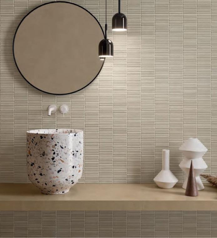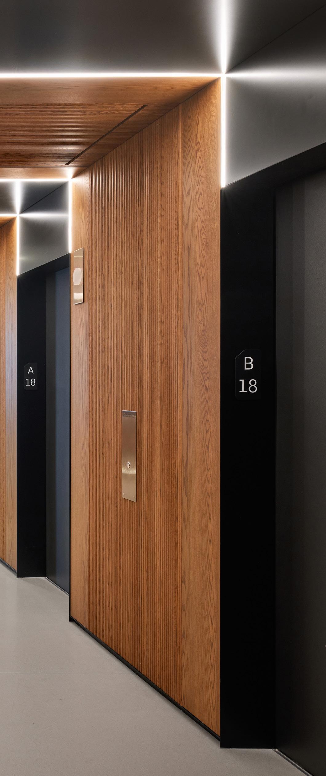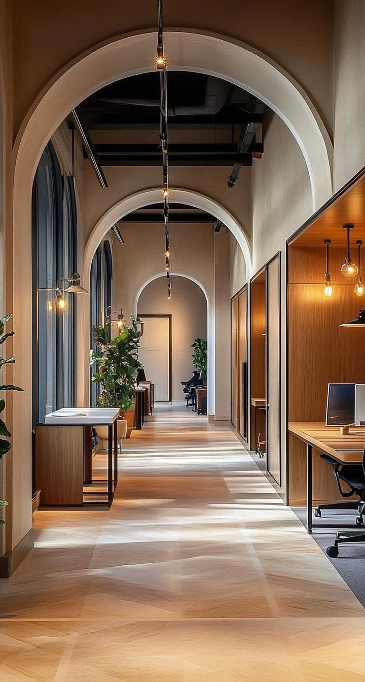 The palette emphasizes natural tones and subtlecontrasts: warm wood, neutrals, and matte metal with accents of rust and bronze. These elements were chosen to convey sustainability, lightness, and durability while supporting flexible layouts. Ceiling and wall gestures introduce rhythm, and subtle flooring shifts define zones without barriers.
